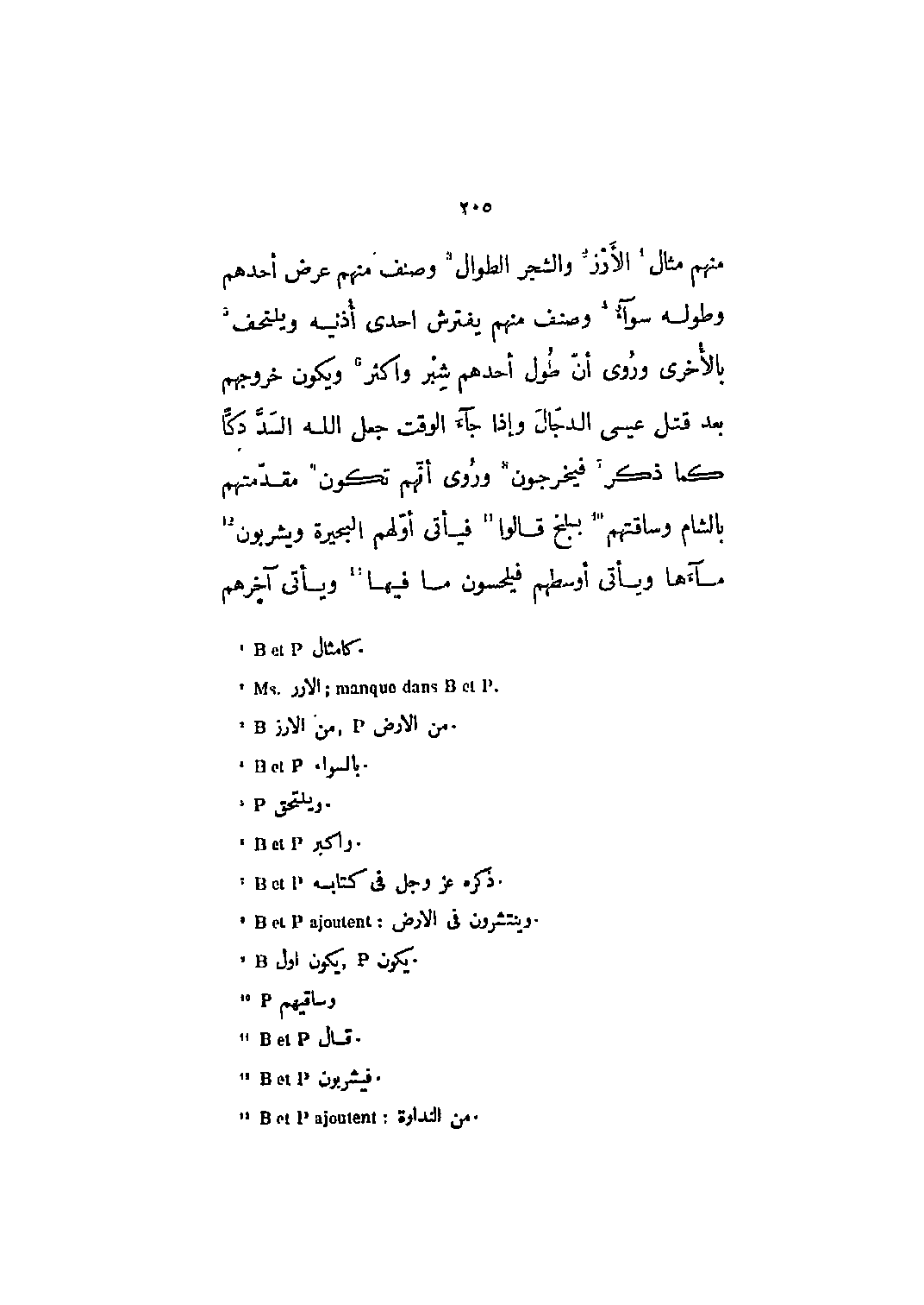 منهم مثال [1] الأرز [2] والشجر الطوال [3] وصنف منهم عرض أحدهم وطوله سواء [4] وصنف منهم يفترش إحدى أذنيه ويلتحف [5] بالأخرى وروى أن طول أحدهم شبر وأكثر [6] ويكون خروجهم بعد قتل عيسى الدجال وإذا جاء الوقت جعل الله السد دكاً كما ذكر [7] فيخرجون [8] وروى أنهم تكون [9] مقدمتهم بالشام وساقتهم [10] ببلخ قالوا [11] فيأتي أولهم البحيرة ويشربون [12] ماءها ويأتي أوسطهم فيلحسون ما فيها [13] ويأتى آخرهم