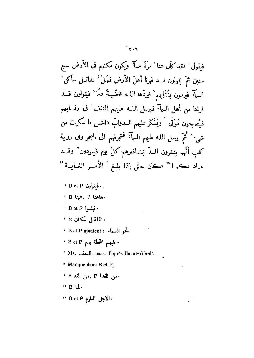 فيقول [1] لقد كان هنا [2] مرة ماء ويكون مكثهم في الأرض سبع سنين ثم يقولون قد قهرنا أهل الأرض فهل [3] نقاتل ساكن [4] السماء فيرمون بنشابهم [5] فيردها الله مخضبة دماً [6] فيقولون قد فرغنا من أهل السماء فيرسل الله عليهم النغف [7] في رقابهم فيصبحون موتى ويسكر عليهم الدواب داخس ما سكرت من شيء [8] ثم يرسل الله عليهم السماء فتجرفهم إلى البحر وفي رواية كعب أنهم ينقرون السد بمناقيرهم كل يوم فيعودون [9] وقد عاد كما [10] كان حتى إذا بلغ الأمر الغاية [11]