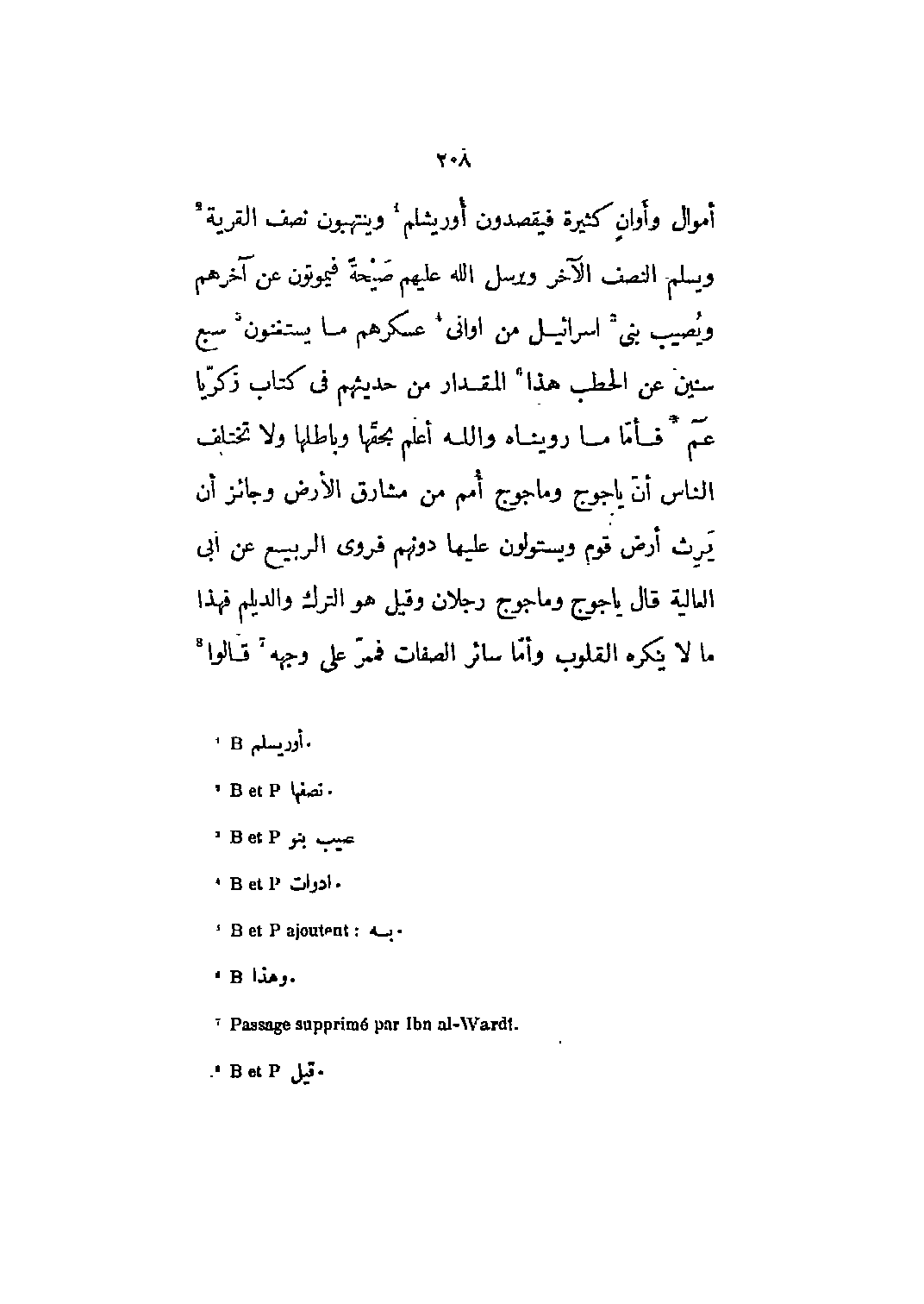 أموال وأوان كثيرة فيقصدون أوريشلم [1] وينتهبون نصف القرية [2] ويسلم النصف الآخر ويرسل الله عليهم صيحة فيموتون عن آخرهم ويصيب بني [3] إسرائيل من أواني [4] عسكرهم ما يستغنون [5] سبع سنين عن الحطب هذا [6] المقدار من حديثهم في كتاب زكريّا عم فأما ما رويناه والله أعلم بحقها وباطلها ولا تختلف الناس أن يأجوج ومأجوج أمم من مشارق الأرض وجائز أن يرث أرض قوم ويستولون عليها دونهم فروى الربيع عن أبي العالية قال يأجوج ومأجوج رجلان وقيل هو الترك والديلم فهذا ما لا ينكره القلوب وأمّا سائر الصفات فممرّ على وجهه [7] قالوا [8]