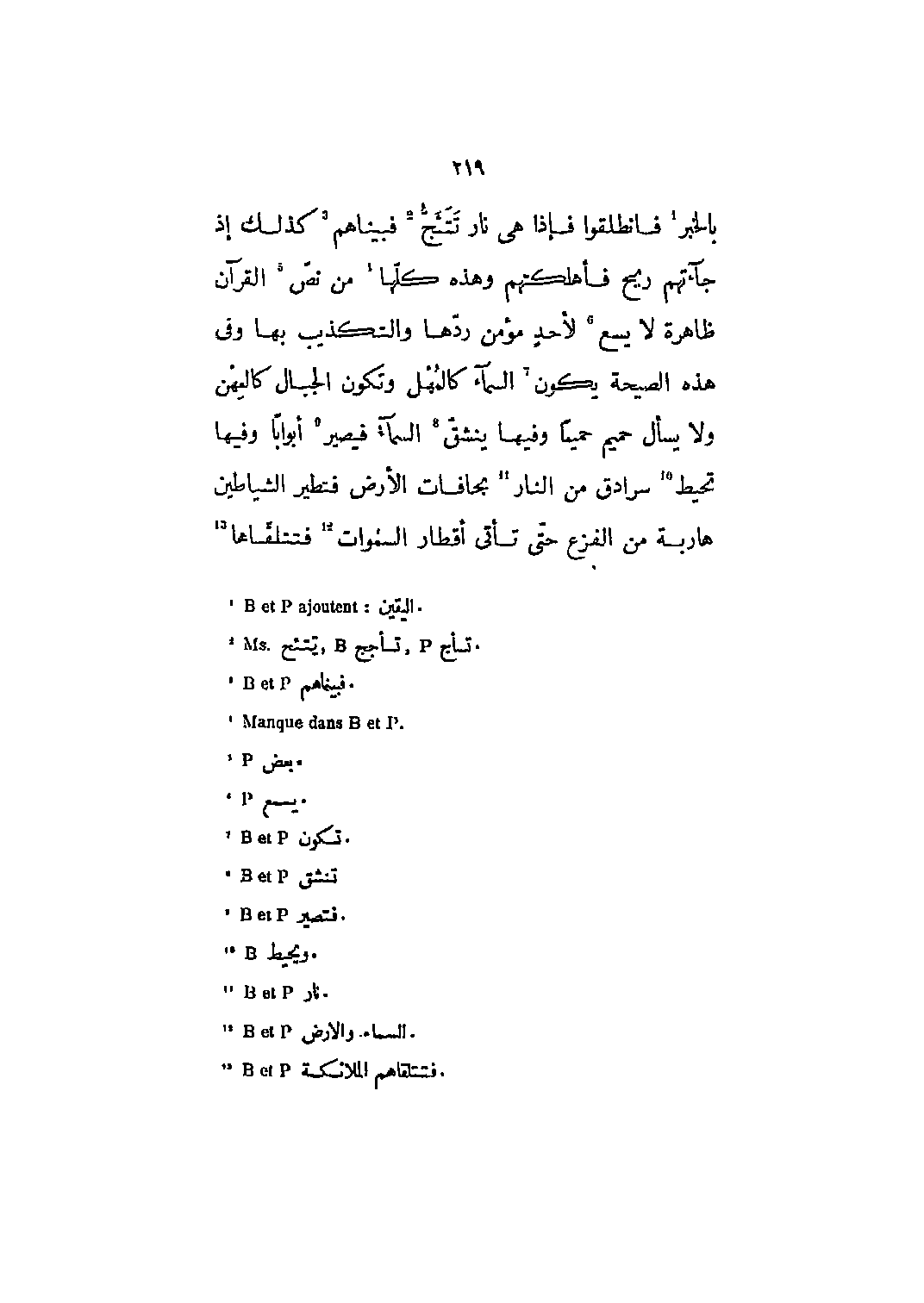 بالخبر [1] فانطلقوا فإذا هي نار تتئج [2] فبينا هم [3] كذلك إذ جاءتهم ريح فأهلكتهم وهذه كلها [4] من نص [5] القرآن ظاهرة لا يسع [6] لأحد مؤمن ردها والتكذيب بها وفي هذه الصيحة يكون [7] السَّماءُ كَالْمُهْلِ وَتَكُونُ الْجِبالُ كَالْعِهْنِ وَلا يَسْئَلُ حَمِيمٌ حَمِيماً 70: 8- 10 وفيها ينشق [8] السماء فيصير [9] أبواباً وفيها تحيط [10] سرادق من النار [11] بحافات الأرض فتطير الشياطين هاربة من الفزع حتى تأتي أقطار السموات [12] فتتلقّاها [13]
