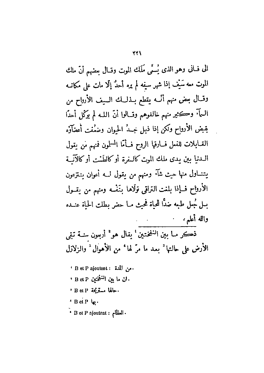 إلى فاني وهو الذي يسمى ملك الموت وقال بعضهم أن ملك الموت معه سيف إذا شهر سيفه لم يره أحد إلا مات على مكانه وقال بعض منهم أنّه يقطع بذلك السيف الأرواح من السماء وكثير منهم خالفوهم وقالوا أنّ الله لم يوكّل أحداً بقبض الأرواح ولكن إذا ذبل جسد الحيوان وضعفت أعضاؤه القابلات للفعل فارقها الروح فأما المسلمون فمنهم من يقول الدنيا بين يدي ملك الموت كالسفرة أو كالطست أو كالآنية يتناول منها حيث شاء ومنهم من يقول له أعوان ينتزعون الأرواح فإذا بلغت التراقي تولاها بنفسه ومنهم من يقول بل جعل طبعه ضدّا للحياة فحيث ما حضر بطلت الحياة عنده والله أعلم،