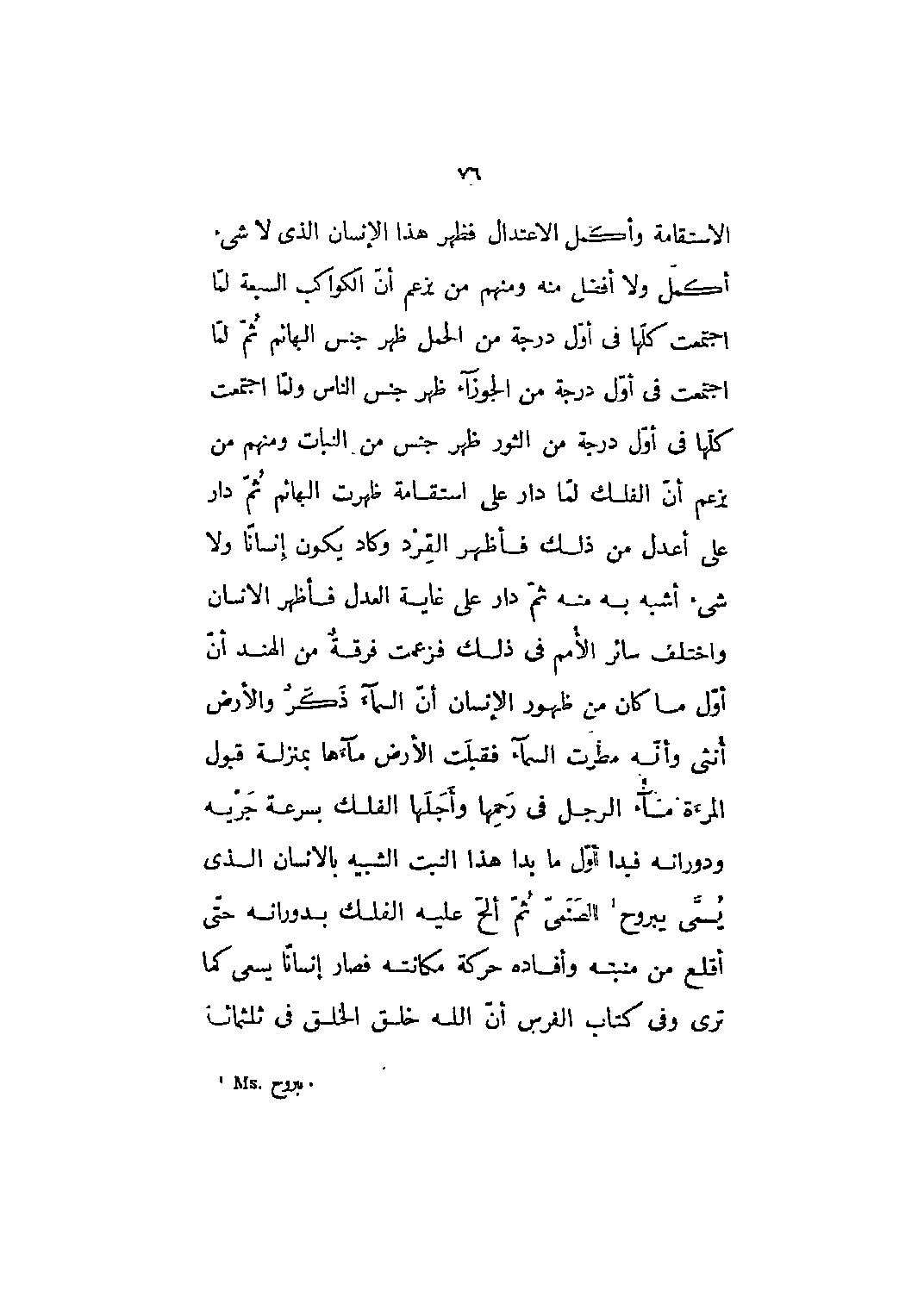 الاستقامة وأكمل الاعتدال فظهر هذا الإنسان الذي لا شيء أكمل ولا أفضل منه ومنهم من يزعم أن الكواكب السبعة لما اجتمعت كلها في أول درجة من الحمل ظهر جنس البهائم ثم لما اجتمعت في أول درجة من الجوزاء ظهر جنس الناس ولما اجتمعت كلها في أول درجة من الثور ظهر جنس من النبات ومنهم من يزعم أن الفلك لما دار على استقامة ظهرت البهائم ثم دار على أعدل من ذلك فأظهر القرد وكاد يكون إنساناً ولا شيء أشبه به منه ثم دار على غاية العدل فأظهر الإنسان واختلف سائر الأمم في ذلك فزعمت فرقة من الهند أن أول ما كان من ظهور الإنسان أن السماء ذكر والأرض أنثى وأنه مطرت السماء فقبلت الأرض ماءها بمنزلة قبول المرأة ماء الرجل في رحمها وأجلها الفلك بسرعة جريه ودورانه فبدأ أول ما بدأ هذا النبت الشبيه بالإنسان الذي يسمى يبروح [1] الصنمي ثم ألح عليه الفلك بدورانه حتى أقلع من منبته وأفاده حركة مكانته فصار إنساناً يسعى كما ترى وفي كتاب الفرس أن الله خلق الخلق في ثلاثمائة