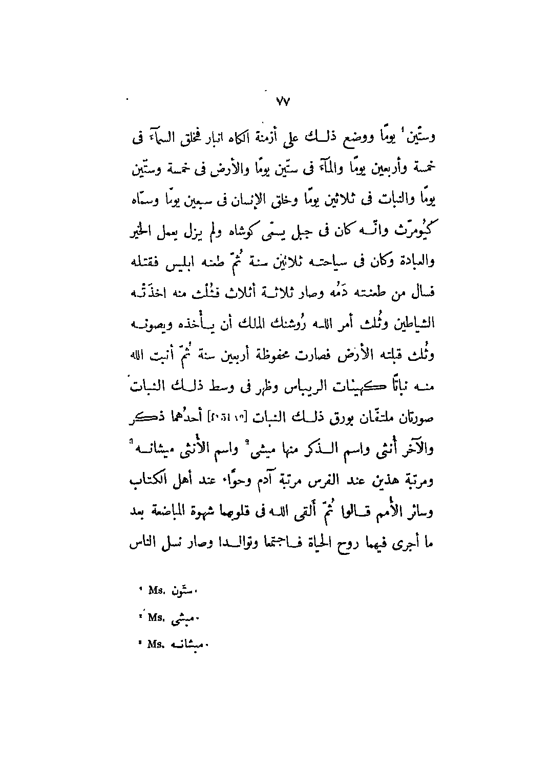وستين [1] يوماً ووضع ذلك على أزمنة الكاه انبار فخلق السماء في خمسة وأربعين يوماً والماء في ستين يوماً والأرض في خمسة وستين يوماً والنبات في ثلاثين يوماً وخلق الإنسان في سبعين يوماً وسماه كيومرث وأنه كان في جبل يسمى كوشاه ولم يزل يعمل الخير والعبادة وكان في سياحته ثلاثين سنة ثم طعنه إبليس فقتله فسال من طعنته دمه وصار ثلاثة أثلاث فثلث منه أخذته الشياطين وثلث أمر الله روشنك الملك أن يأخذه ويصونه وثلث قبلته الأرض فصارت محفوظة أربعين سنة ثم أنبت الله منه نباتاً كهيئات الريباس وظهر في وسط ذلك النبات صورتان ملتفان بورق ذلك النبات [51] أحدهما ذكر والآخر أنثى واسم الذكر منها ميشي [2] واسم الأنثى ميشانه [3] ومرتبة هذين عند الفرس مرتبة آدم وحواء عند أهل الكتاب وسائر الأمم قالوا ثم ألقى الله في قلوبهما شهوة المباضعة بعد ما أجرى فيهما روح الحياة فاجتمعا وتوالدا وصار نسل الناس
