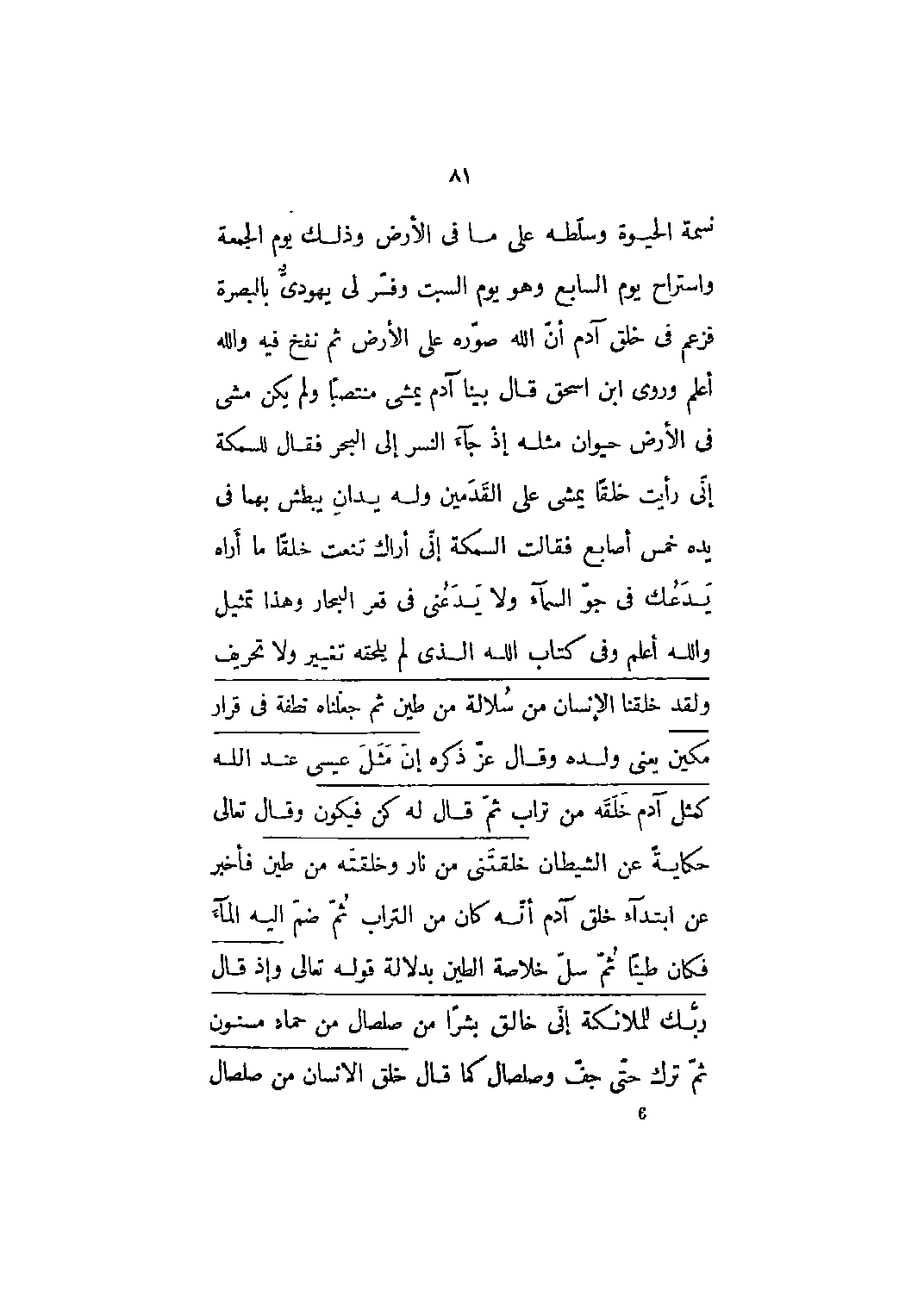 نسمة الحياة وسلطه على ما في الأرض وذلك يوم الجمعة واستراح يوم السابع وهو يوم السبت وفسر لي يهودي بالبصرة فزعم في خلق آدم أن الله صوره على الأرض ثم نفخ فيه والله أعلم وروى ابن إسحاق قال بينا آدم يمشي منتصباً ولم يكن مشى في الأرض حيوان مثله إذ جاء النسر إلى البحر فقال للسمكة إني رأيت خلقاً يمشي على القدمين وله يدان يبطش بهما في يده خمس أصابع فقالت السمكة إني أراك تنعت خلقاً ما أراه يدعك في جو السماء ولا يدعني في قعر البحار وهذا تمثيل والله أعلم وفي كتاب الله الذي لم يلحقه تغيير ولا تحريف وَلَقَدْ خَلَقْنَا الْإِنْسانَ من سُلالَةٍ من طِينٍ ثُمَّ جَعَلْناهُ نُطْفَةً في قَرارٍ مَكِينٍ 23: 12- 13 يعني ولده وقال عز ذكره إِنَّ مَثَلَ عِيسى عِنْدَ الله كَمَثَلِ آدَمَ خَلَقَهُ من تُرابٍ ثُمَّ قال لَهُ كُنْ فَيَكُونُ 3: 59 وقال تعالى حكاية عن الشيطان خَلَقْتَنِي من نارٍ وَخَلَقْتَهُ من طِينٍ 7: 12 فأخبر عن ابتداء خلق آدم أنه كان من التراب ثم ضم إليه الماء فكان طيناً ثم سل خلاصة الطين بدلالة قوله تعالى وَإِذْ قال رَبُّكَ لِلْمَلائِكَةِ إِنِّي خالِقٌ بَشَراً من صَلْصالٍ من حَمَإٍ مَسْنُونٍ 15: 28 ثم ترك حتى جف وصلصال كما قال خَلَقَ الْإِنْسانَ من صَلْصالٍ