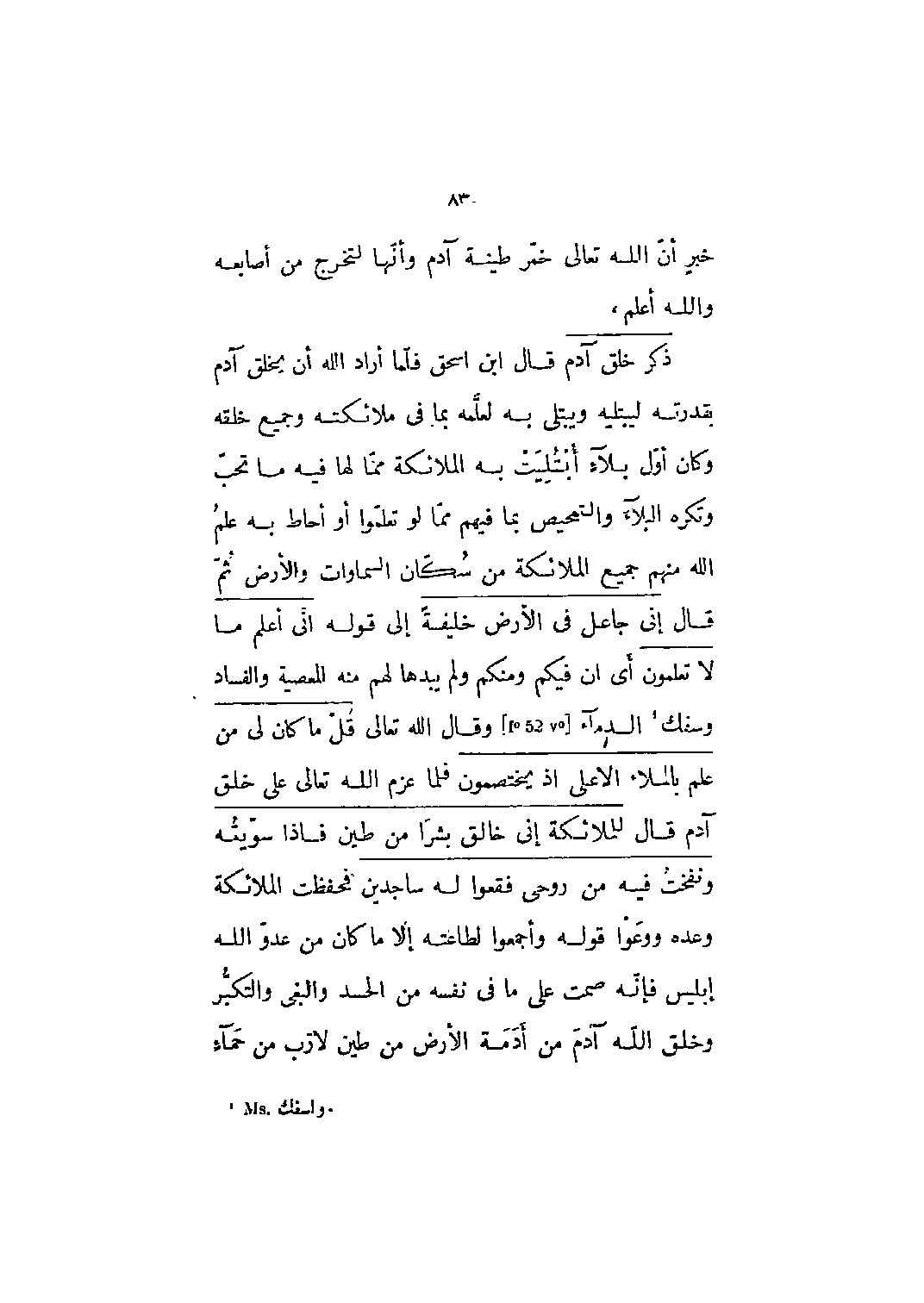 قال ابن إسحاق فلما أراد الله أن يخلق آدم بقدرته ليبتليه ويبتلى به لعلمه بما في ملائكته وجميع خلقه وكان أول بلاء ابتليت به الملائكة مما لها فيه ما تحب وتكره البلاء والتمحيص بما فيهم ممّا لو تعلموا أو أحاط به علم الله منهم جميع الملائكة من سكان السماوات والأرض ثم قال إِنِّي جاعِلٌ في الْأَرْضِ خَلِيفَةً 2: 30 إلى قوله إِنِّي أَعْلَمُ ما لا تَعْلَمُونَ 2: 30 أي أن فيكم ومنكم ولم يبدها لهم منه المعصية والفساد وسفك [1] الدماء [52] وقال الله تعالى ما كانَ لِي من عِلْمٍ بِالْمَلَإِ الْأَعْلى إِذْ يَخْتَصِمُونَ 38: 69 فلما عزم الله تعالى على خلق آدم قال للملائكة إِنِّي خالِقٌ بَشَراً من طِينٍ فَإِذا سَوَّيْتُهُ وَنَفَخْتُ فِيهِ من رُوحِي فَقَعُوا لَهُ ساجِدِينَ 38: 71- 72 فحفظت الملائكة وعده ووعوا قوله وأجمعوا لطاعته إلا ما كان من عدو الله إبليس فإنه صمت على ما في نفسه من الحسد والبغي والتكبر وخلق الله آدم من أدمة الأرض من طين لازب من حمإ