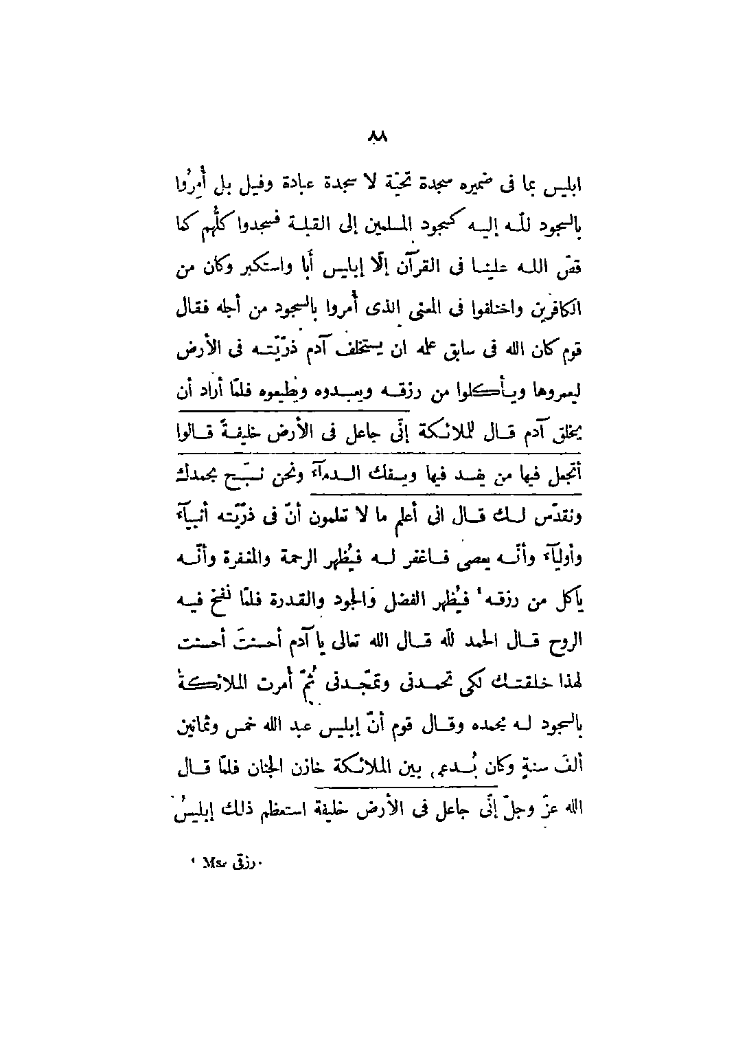 إبليس بما في ضميره سجدة تحية لا سجدة عباده وفيل بل أمروا بالسجود للَّه إليه كسجود المسلمين إلى القبلة فسجدوا كلهم كما قص الله علينا في القرآن إِلَّا إِبْلِيسَ أَبى وَاسْتَكْبَرَ وَكانَ من الْكافِرِينَ 2: 34 واختلفوا في المعنى الذي أمروا بالسجود من أجله فقال قوم كان الله في سابق علمه أن يستخلف آدم ذريته في الأرض ليعمروها ويأكلوا من رزقه ويعبدوه ويطيعوه فلما أراد أن يخلق آدم قال للملائكة إِنِّي جاعِلٌ في الْأَرْضِ خَلِيفَةً قالُوا أَتَجْعَلُ فِيها من يُفْسِدُ فِيها وَيَسْفِكُ الدِّماءَ وَنَحْنُ نُسَبِّحُ بِحَمْدِكَ وَنُقَدِّسُ لَكَ قال إِنِّي أَعْلَمُ ما لا تَعْلَمُونَ 2: 30 أن في ذريته أنبياء وأولياء وأنه يعصى فاغفر له فيظهر الرحمة والمغفرة وأنه يأكل من رزقه [1] فيظهر الفضل والجود والقدرة فلما نفخ فيه الروح قال الحمد للَّه قال الله تعالى يا آدم أحسنت أحسنت لهذا خلقتك لكي تحمدني وتمجدني ثم أمرت الملائكة بالسجود له بحمده وقال قوم أن إبليس عبد الله خمس وثمانين ألف سنة وكان يدعى بين الملائكة خازن الجنان فلما قال الله عز وجل إِنِّي جاعِلٌ في الْأَرْضِ خَلِيفَةً 2: 30 استعظم ذلك إبليس