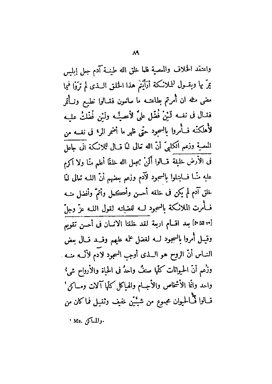 واعتقد الخلاف والمعصية فلما خلق الله طينة آدم جعل إبليس يمر بها ويقول للملائكة أرأيتم هذا الخلق الذي لم تروا فيما مضى مثله أن أمرتم بطاعته ما صانعون فقالوا نطيع ونأتمر فقال في نفسه لئن فضل على لأعصينه ولئن فضلت عليه لأهلكنه فأمروا بالسجود حتى ظهر ما أضمر المرء في نفسه من المعصية وزعم الكلبي أن الله تعالى لما قال للملائكة إِنِّي جاعِلٌ في الْأَرْضِ خَلِيفَةً 2: 30 قالوا ألن يجعل الله خلقاً أعلم منا ولا أكرم عليه منا فابتلوا بالسجود لآدم وزعم بعضهم أن الله تعالى لما خلق آدم لم يكن في خلقه أحسن وأكمل وأتم وأفضل منه فأمرت الملائكة بالسجود له لفضيلته لقول الله عز وجل [53] بعد أقسام أربعة لَقَدْ خَلَقْنَا الْإِنْسانَ في أَحْسَنِ تَقْوِيمٍ 95: 4 وقيل أمروا بالسجود له لفضل علمه عليهم وقد قال بعض الناس أن الروح هو الذي أوجب السجود لآدم لأنه منه وزعم أن الحيوانات كلها صنف واحد في الحياة والأرواح شيء واحد وإنما الأشخاص والأجسام والهياكل كلها آلات ومساكن [1] قالوا فالحيوان مجموع من شيئين خفيف وثقيل فما كان من