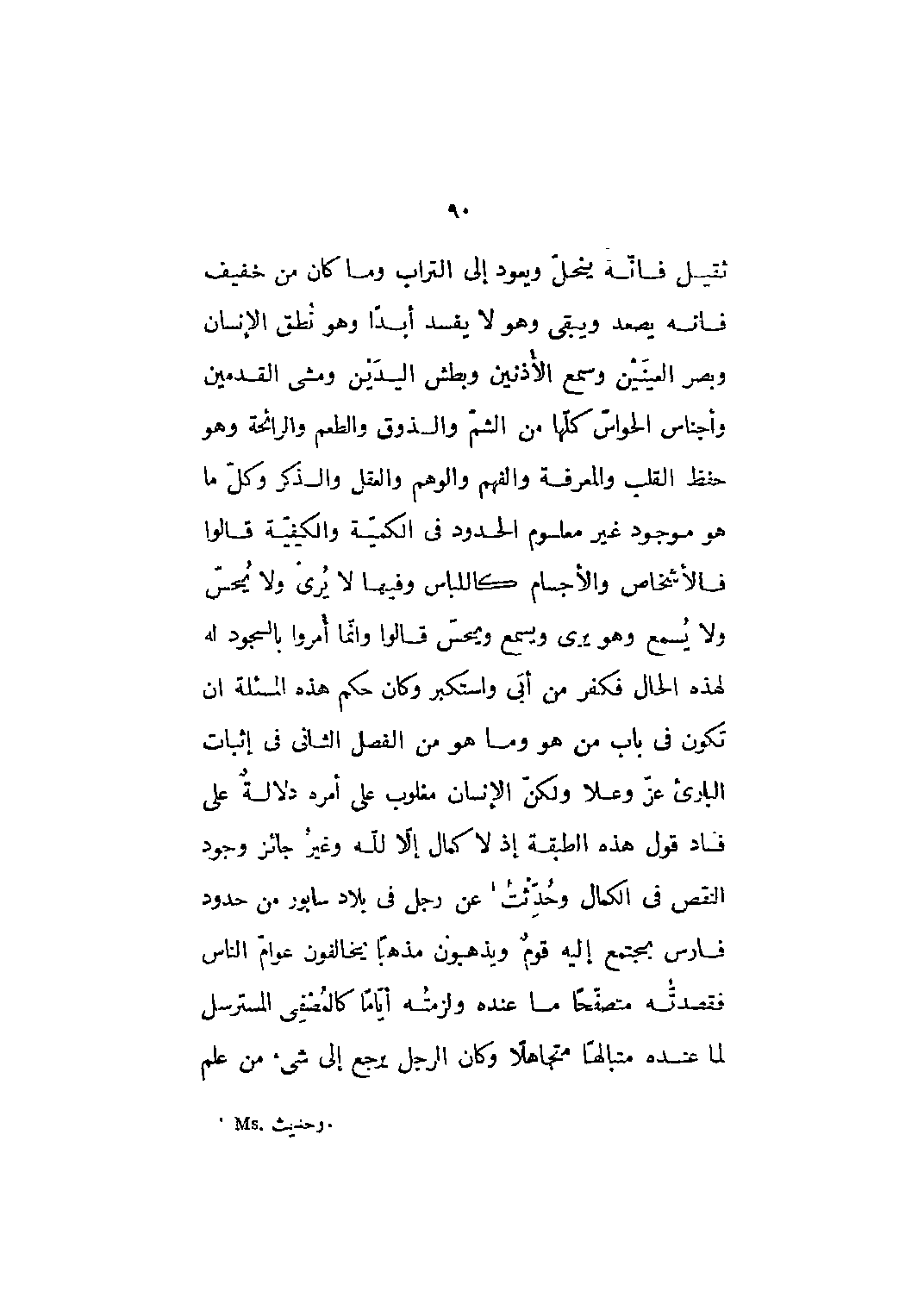 ثقيل فإنه ينحل ويعود إلى التراب وما كان من خفيف فإنه يصعد ويبقى وهو لا يفسد أبداً وهو نطق الإنسان وبصر العينين وسمع الأذنين وبطش اليدين ومشى القدمين وأجناس الحواس كلها من الشم والذوق والطعم والرائحة وهو حفظ القلب والمعرفة والفهم والوهم والعقل والذكر وكل ما هو موجود غير معلوم الحدود في الكمية والكيفية قالوا فالأشخاص والأجسام كاللباس وفيها لا يرى ولا يحس ولا يسمع وهو يرى ويسمع ويحس قالوا وإنما أمروا بالسجود له لهذه الحال فكفر من أبى واستكبر وكان حكم هذه المسألة أن تكون في باب من هو وما هو من الفصل الثاني في إثبات البارئ عز وعلا ولكن الإنسان مغلوب على أمره دلالة على فساد قول هذه الطبقة إذ لا كمال إلا للَّه وغير جائز وجود النقص في الكمال وحدثت [1] عن رجل في بلاد سابور من حدود فارس يجتمع إليه قوم ويذهبون مذهباً يخالفون عوام الناس فقصدته متصفحاً ما عنده ولزمته أياماً كالمصفى المسترسل لما عنده متبالهاً متجاهلاً وكان الرجل يرجع إلى شيء من علم