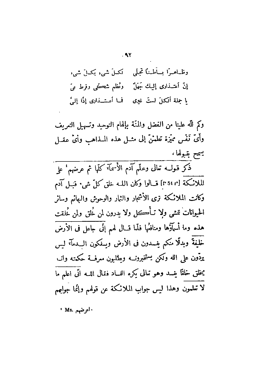 [54] قالوا وكان الله خلق كل شيء قبل آدم وكانت الملائكة ترى الأشجار والثمار والوحوش والبهائم وسائر الحيوانات تمشي ولا تأكل ولا يدرون لمن خلق ولمن خلقت هذه وما أسماؤها ومنافعها فلما قال لهم إِنِّي جاعِلٌ في الْأَرْضِ خَلِيفَةً 2: 30 وبدلاً منكم يفسدون في الأرض ويسفكون الدماء ليس يردون على الله ولكن يستخبرونه ويطلبون معرفة حكمته وأنه يخلق خلقاً يفسد وهو تعالى يكره الفساد فقال الله إِنِّي أَعْلَمُ ما لا تَعْلَمُونَ 2: 30 وهذا ليس جواب الملائكة عن قولهم وإنّما جوابهم