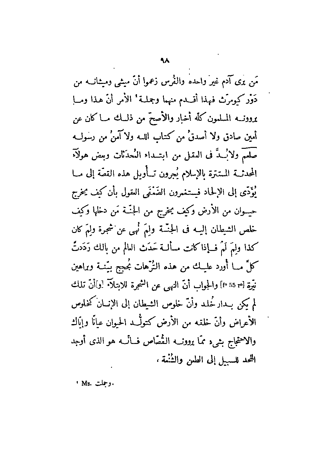 من يرى آدم غير واحده والفرس زعموا أن ميشى وميشانه من دور كيومرث فهذا أقدم منهما وجملة [1] الأمر أن هذا وما يروونه المسلمون كله أخبار والأصح من ذلك ما كان عن أمين صادق ولا أصدق من كتاب الله ولا آمن من رسوله صلى الله عليه وسلم ولا بدّ في العقل من ابتداء المحدثات وبعض هؤلاء المحدثة المستترة بالإسلام يجرون تأويل هذه القصة إلى ما يؤدي إلى الإلحاد فيستغمرون الضعفى العقول بأن كيف يخرج حيوان من الأرض وكيف يخرج من الجنة من دخلها وكيف خلص الشيطان إليه في الجنة ولم نهى عن شجرة ولم كان كذا ولِمِ لَمْ فإذا كانت مسألة حدث العالم من بالك رددت كلّ ما أورد عليه من هذه الترهات بحجج بينه وبراهين نيره [55] والجواب أنّ النهى عن الشجرة للابتلاء [و] أنّ تلك لم يكن بدار خلد وأن خلوص الشيطان إلى الإنسان كخلوص الأعراض وأنّ خلقه من الأرض كتولّد الحيوان عياناً وإياك والاحتجاج بشيء مما يروونه القصاص فإنه هو الذي أوجد الملحد للسبيل إلى الطعن والشنعة،