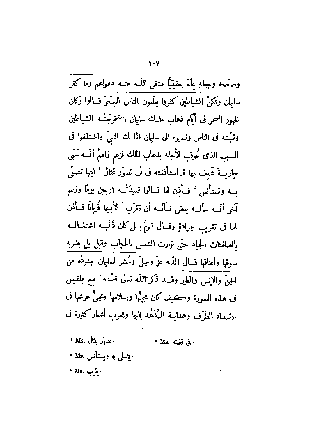 وصححه وجعله علما حقيقيا فنفى الله عنه دعواهم وَما كَفَرَ سُلَيْمانُ وَلكِنَّ الشَّياطِينَ كَفَرُوا يُعَلِّمُونَ النَّاسَ السِّحْرَ 2: 102 قالوا وكان ظهور السحر في أيام ذهاب ملك سليمان استخرجته الشياطين وثبته في الناس ونسبوه إلى سليمان الملك النبي واختلفوا في السبب الذي عوقب لأجله بذهاب الملك فزعم زاعم أنه سبى جارية شعف بها فاستأذنته في أن تصور تمثال [1] ابنها تتسلى به وتستأنس [2] فأذن لها قالوا فعبدته أربعين يوما وزعم آخر أنه سأله بعض نسائه أن تقرب [3] لأبيها قربانا فأذن لها في تقريب جرادة وقال قوم بل كان ذنبه اشتغاله بالصافنات الجياد حتى توارت الشمس بالحجاب وقيل بل بضربة سوقها وأعناقها قال الله عز وجل وَحُشِرَ لِسُلَيْمانَ جُنُودُهُ من الْجِنِّ وَالْإِنْسِ وَالطَّيْرِ 27: 17 وقد ذكر الله تعالى قصته [4] مع بلقيس في هذه السورة وكيف كان مجيئها وإسلامها ومجيء عرشها في ارتداد الطرف وهداية الهدهد إليها وللعرب أشعار كثيرة في