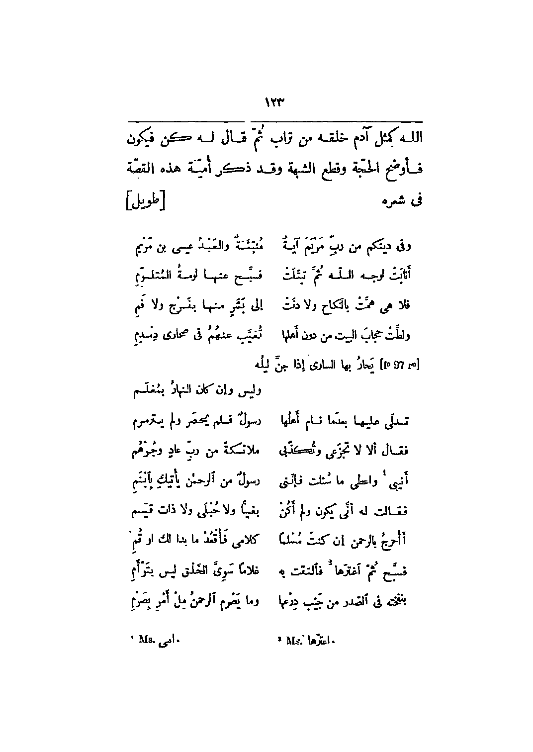 إِنَّ مَثَلَ عِيسى عِنْدَ الله كَمَثَلِ آدَمَ خَلَقَهُ من تُرابٍ ثُمَّ قال لَهُ كُنْ فَيَكُونُ 3: 59 فأوضح الحجة وقطع الشبهة وقد ذكر أميّة هذه القصّة في شعره [طويل]