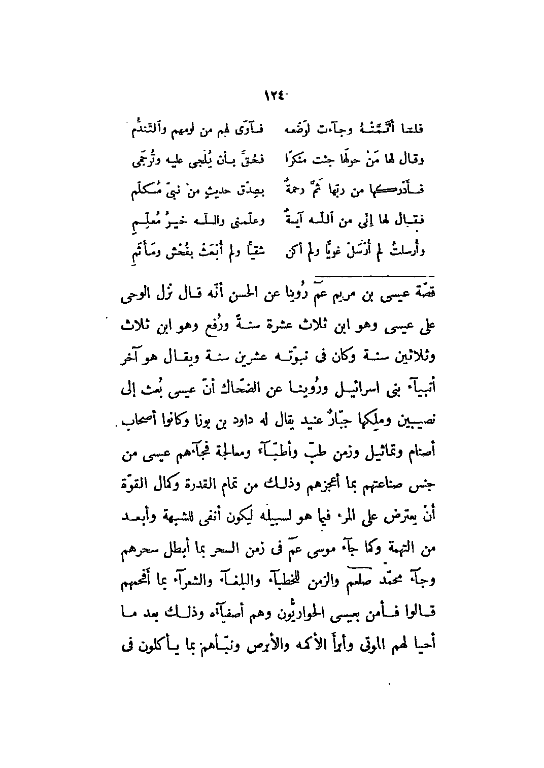 روينا عن الحسن أنه قال نزل الوحي على عيسى وهو ابن ثلاث عشرة سنة ورفع وهو ابن ثلاث وثلاثين سنة وكان في نبوته عشرين سنة ويقال هو آخر أنبياء بني إسرائيل وروينا عن الضحاك أن عيسى بعث إلى نصيبين وملكها جبار عنيد يقال له داود بن بوزا وكانوا أصحاب أصنام وتماثيل وزمن طب وأطباء ومعالجة فجاءهم عيسى من جنس صناعتهم بما أعجزهم وذلك من تمام القدرة وكمال القوة أن يعترض على المرء فيما هو لسبيله ليكون أنفى للشبهة وأبعد من التهمة وكما جاء موسى عم في زمن السحر بما أبطل سحرهم وجاء محمّد صلى الله عليه وسلم والزمن للخطباء والبلغاء والشعراء بما أفحمهم قالوا فأمن بعيسى الحواريّون وهم أصفياءه وذلك بعد ما أحيا لهم الموتى وأبرأ الأكمة والأبرص ونبأهم بما يأكلون في