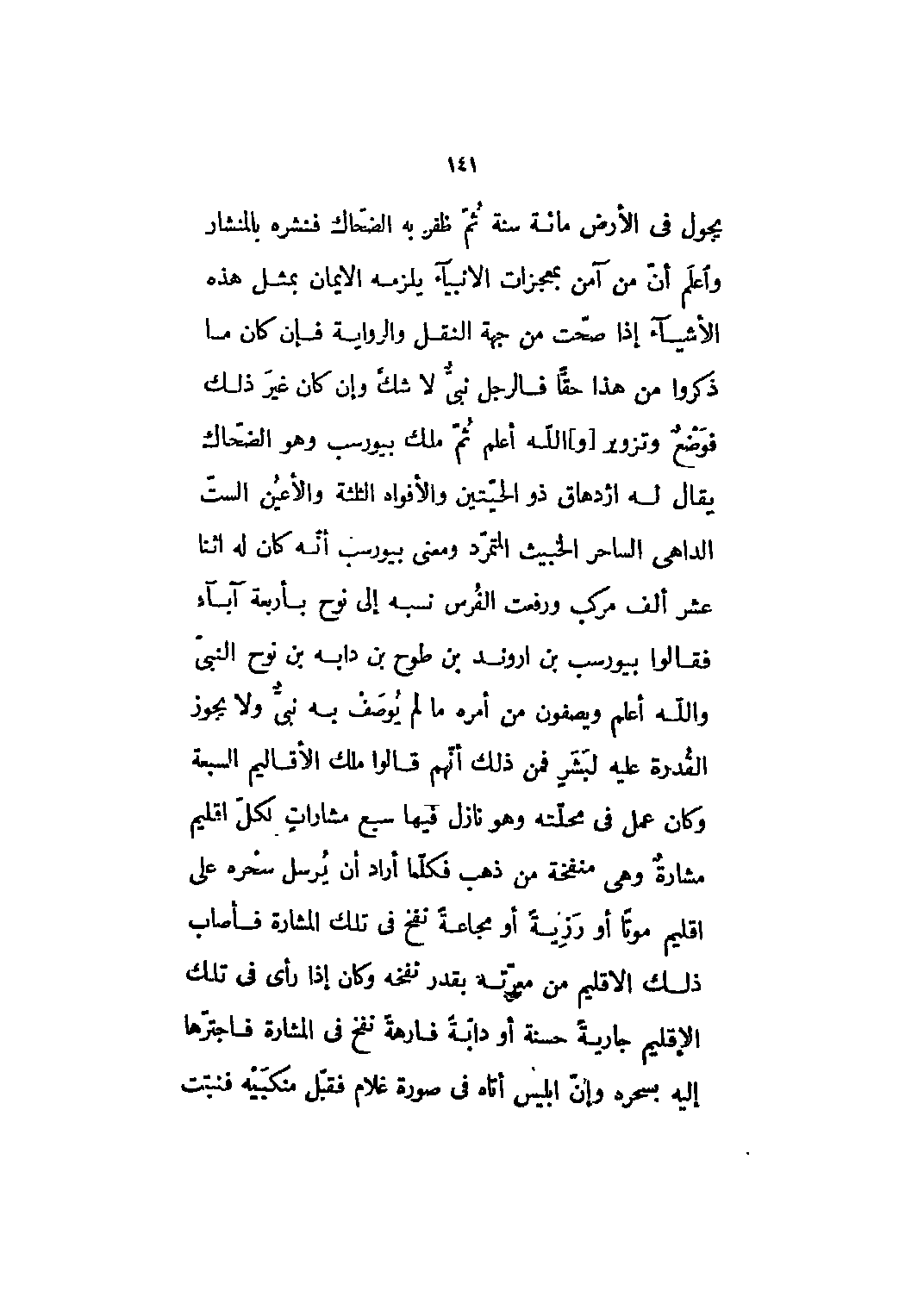 يجول في الأرض مائة سنة ثم ظفر به الضحّاك فنشره بالمنشار واعلم أنّ من آمن بمعجزات الأنبياء يلزمه الإيمان بمثل هذه الأشياء إذا صحت من جهة النقل والرواية فإن كان ما ذكروا من هذا حقا فالرجل نبي لا شك وإن كان غير ذلك فوضع وتزوير [و] الله أعلم ثمّ ملك بيورسب وهو الضحّاك يقال له اژدهاق ذو الحيّتين والأفواه الثلاثة والأعين الست الداهي الساحر الخبيث المتمرد ومعنى بيورسب أنه كان له اثنا عشر ألف مركب ورفعت الفرس نسبه إلى نوح بأربعة آباء فقالوا بيورسب بن اروند بن طوح بن دابة بن نوح النبي والله أعلم ويصفون من أمره ما لم يوصف به نبي ولا يجوز القدرة عليه لبشر فمن ذلك أنهم قالوا ملك الأقاليم السبعة وكان عمل في محلته وهو نازل فيها سبع مشارات لكل اقليم مشارة وهي منفخة من ذهب فكلما أراد أن يرسل سحره على أقليم موتا أو رزية أو مجاعة نفخ في تلك المشارة فأصاب ذلك الإقليم من معرته بقدر نفخه وكان إذا رأى في تلك الإقليم جارية حسنة أو دابة فارهة نفخ في المشارة فاجترها إليه بسحره وإن ابليس أتاه في صورة غلام فقبل منكبيه فنبتت