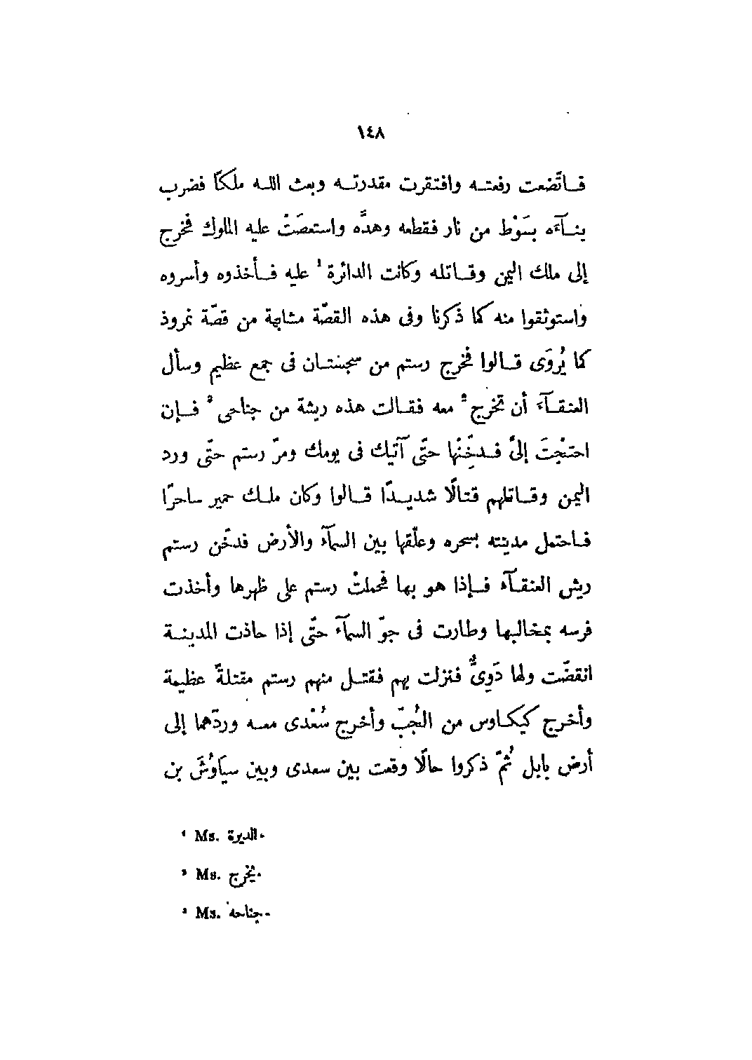 فاتّضعت رفعته وافتقرت مقدرته وبعث الله ملكا فضرب بناءه بسوط من نار فقطعه وهده واستعصت عليه الملوك فخرج إلى ملك اليمن وقاتله وكانت الدائرة [1] عليه فأخذوه وأسروه واستوثقوا منه كما ذكرنا وفي هذه القصّة مشابهة من قصة نمروذ كما يروى قالوا فخرج رستم من سجستان في جمع عظيم وسأل العنقاء أن تخرج [2] معه فقالت هذه ريشة من جناحي [3] فإن احتجت إلي فدخنها حتى آتيك في يومك ومر رستم حتى ورد اليمن وقاتلهم قتالا شديدا قالوا وكان ملك حمير ساحرا فاحتمل مدينته بسحره وعلقها بين السماء والأرض فدخن رستم ريش العنقاء فإذا هو بها فحملت رستم على ظهرها وأخذت فرسه بمخالبها وطارت في جوّ السماء حتّى إذا حاذت المدينة انقضّت ولها دوى فنزلت بهم فقتل منهم رستم مقتلة عظيمة وأخرج كيكاوس من الجب وأخرج سعدى معه وردهما إلى أرض بابل ثم ذكروا حالا وقعت بين سعدى وبين سياوش بن