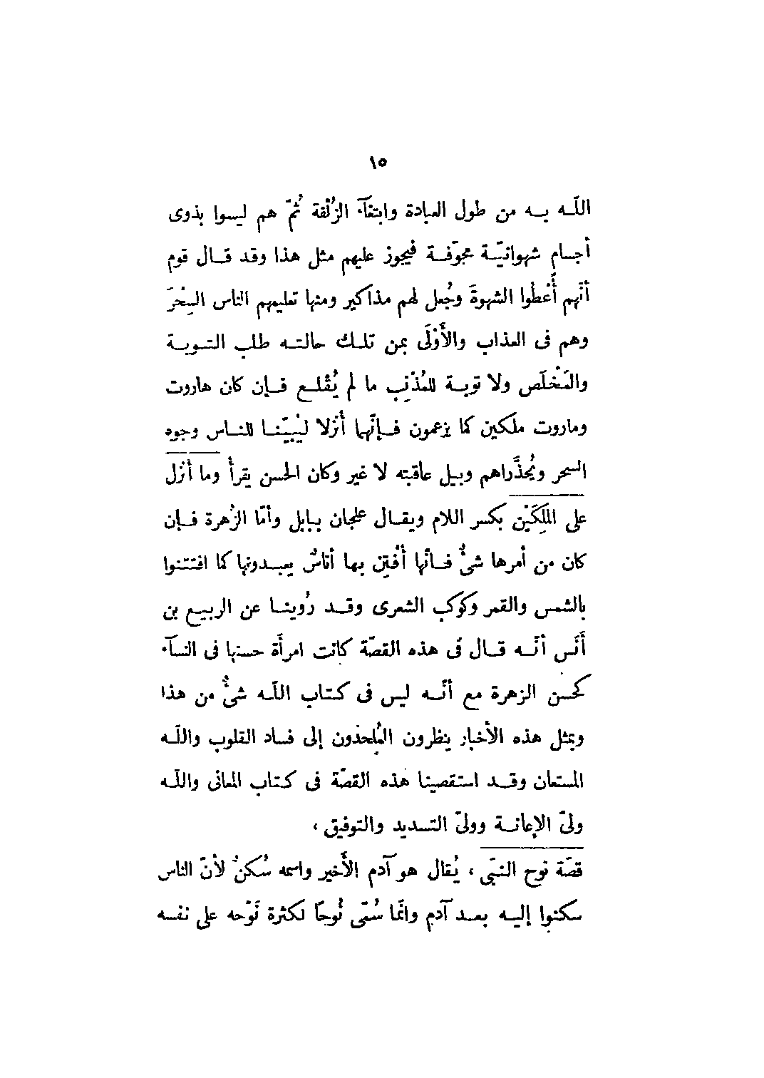 الله به من طول العبادة وابتغاء الزلفة ثم هم ليسوا بذوي أجسام شهوانية مجوفة فيجوز عليهم مثل هذا وقد قال قوم أنهم أعطوا الشهوة وجعل لهم مذاكير ومنها تعليمهم الناس السحر وهم في العذاب والأولى بمن تلك حالته طلب التوبة والمخلص ولا توبة للمذنب ما لم يقلع فإن كان هاروت وماروت ملكين كما يزعمون فإنهما أنزلا ليبينا للناس وجوه السحر ويحذراهم وبيل عاقبته لا غير وكان الحسن يقرأ وَما أُنْزِلَ عَلَى الْمَلَكَيْنِ 2: 102 بكسر اللام ويقال علجان ببابل وأما الزهرة فإن كان من أمرها شيء فإنها أفتن بها أناس يعبدونها كما افتتنوا بالشمس والقمر وكوكب الشعري وقد روينا عن الربيع بن أنس أنه قال في هذه القصة كانت امرأة حسنها في النساء كحسن الزهرة مع أنه ليس في كتاب الله شيء من هذا وبمثل هذه الأخبار ينظرون الملحدون إلى فساد القلوب والله المستعان وقد استقصينا هذه القصة في كتاب المعاني والله ولي الإعانة وولي التسديد والتوفيق،