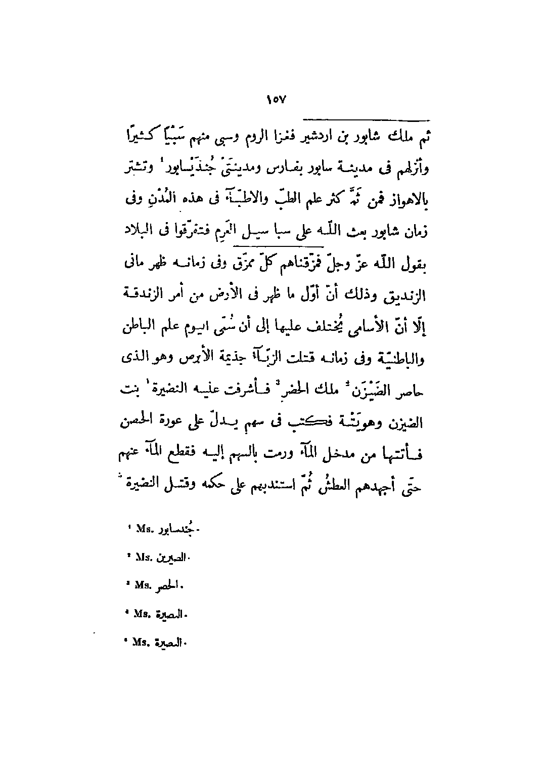 فغزا الروم وسبى منهم سبيا كثيرا وأنزلهم في مدينة سابور بفارس ومدينتي جنديسابور [1] وتشتر بالأهواز فمن ثم كثر علم الطب والأطباء في هذه المدن وفي زمان شابور بعث الله على سبا سيل العرم فتفرقوا في البلاد بقول الله عزّ وجلّ وَمَزَّقْناهُمْ كُلَّ مُمَزَّقٍ 34: 19 وفي زمانه ظهر ماني الزنديق وذلك أن أول ما ظهر في الأرض من أمر الزندقة إلا أن الاسامي يختلف عليها إلى أن سمي اليوم علم الباطن والباطنيّة وفي زمانه قتلت الزباء جذيمة الأبرص وهو الذي حاصر الضيزن [2] ملك الحضر [3] فأشرفت عليه النضيرة [4] بنت الضيزن وهويته فكتب في سهم يدل على عورة الحصن فأتتها من مدخل الماء ورمت بالسهم إليه فقطع الماء عنهم حتى أجهدهم العطش ثم استندبهم على حكمه وقتل النضيرة [5]