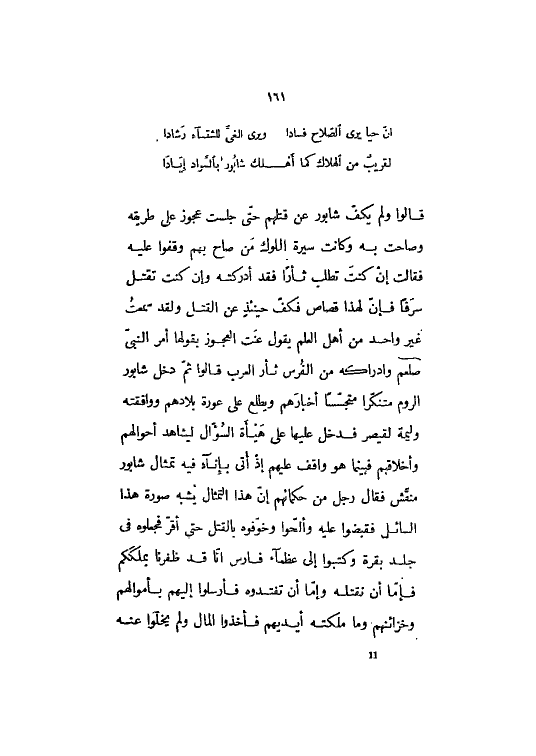 قالوا ولم يكف شابور عن قتلهم حتى جلست عجوز على طريقه وصاحت به وكانت سيرة الملوك من صاح بهم وقفوا عليه فقالت إن كنت تطلب ثأرا فقد أدركته وإن كنت تقتل سرفا فإن لهذا قصاص فكف حينئذ عن القتل ولقد سمعت غير واحد من أهل العلم يقول عنت العجوز بقولها أمر النبيّ صلى الله عليه وسلم وادراكه من الفرس ثأر العرب قالوا ثم دخل شابور الروم متنكرا متجسسا أخبارهم ويطلع على عورة بلادهم ووافقته وليمة لقيصر فدخل عليها على هيئة السؤال ليشاهد أحوالهم وأخلاقهم فبينما هو واقف عليهم إذ أتى بإناء فيه تمثال شابور منقش فقال رجل من حكمائهم إن هذا التمثال يشبه صورة هذا السائل فقبضوا عليه وألحوا وخوفوه بالقتل حتى أقر فجعلوه في جلد بقرة وكتبوا إلى عظماء فارس انا قد ظفرنا بملككم فإما أن نقتله وإما أن تفتدوه فأرسلوا إليهم بأموالهم وخزائنهم وما ملكته أيديهم فأخذوا المال ولم يخلوا عنه
