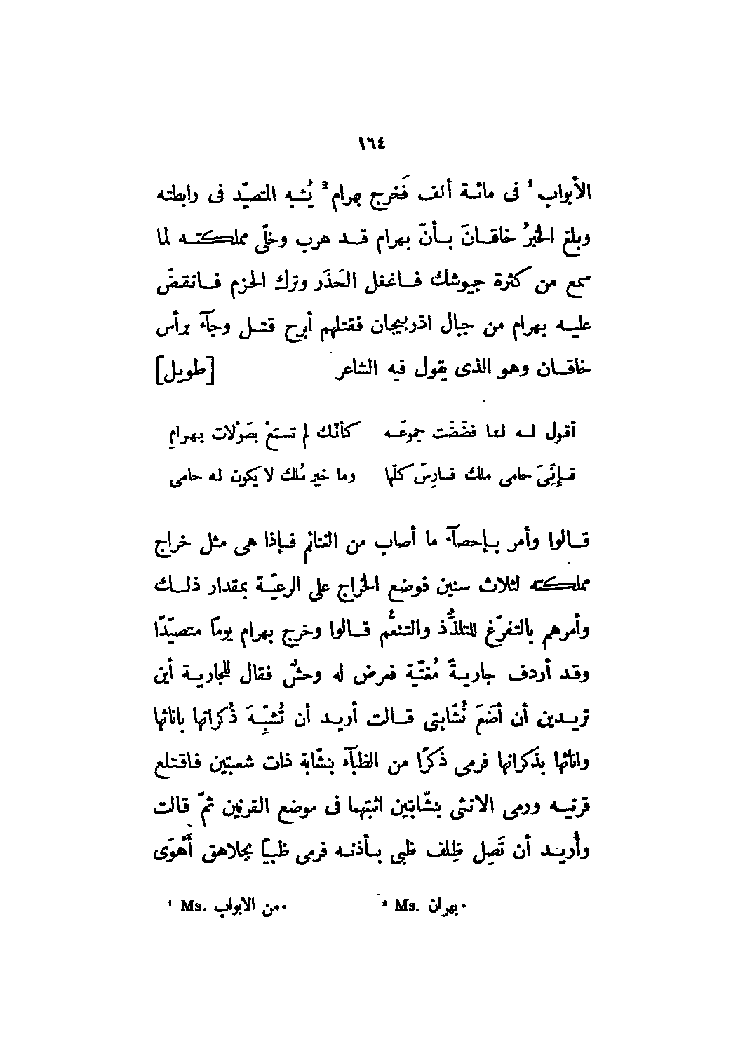 قالوا وأمر بإحصاء ما أصاب من الغنائم فإذا هي مثل خراج مملكته لثلاث سنين فوضع الخراج على الرعية بمقدار ذلك وأمرهم بالتفرغ للتلذذ والتنعم قالوا وخرج بهرام يوما متصيدا وقد أردف جارية مغنية فعرض له وحش فقال للجارية أين تريدين أن أضع نشابتي قالت أريد أن تشبه ذكرانها بإناثها وإناثها بذكرانها فرمى ذكرا من الظباء بنشابة ذات شعبتين فاقتلع قرنيه ورمى الأنثى بنشابتين أثبتهما في موضع القرنين ثم قالت وأريد أن تصل ظلف ظبي بأذنه فرمى ظبيا بجلاهق أهوى