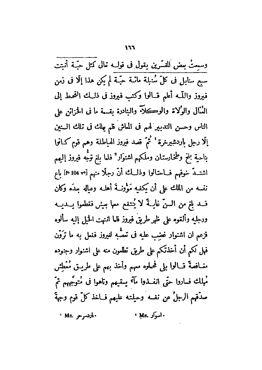 وسمعت بعض المفسرين يقول في قوله تعالى كَمَثَلِ حَبَّةٍ أَنْبَتَتْ سَبْعَ سَنابِلَ في كُلِّ سُنْبُلَةٍ مِائَةُ حَبَّةٍ 2: 261 لم يكن هذا إلا في زمن فيروز والله أعلم قالوا وكتب فيروز في ذلك القحط إلى العمال والولاة والوكلاء والبنادرة بقسمة ما في الخزائن على الناس وحسن التدبير لهم في المعاش فلم يهلك في تلك السنين إلا رجل باردشيرخرة [1] ثم قصد فيروز الهياطلة وهم قوم كانوا بناحية بلخ وطخارستان وملكهم اشنوار [2] فلما بلغ توجه فيروز إليهم اشتد خوفهم فاحتالوا وذلك أن رجلا منهم [104] باع نفسه من الملك على أن يكفيه مئونة أهله وعياله بعده وكان قد بلغ من السن غاية لا ينتفع معها بعيش فقطعوا يديه ورجليه والقوة على ظهر طريق فيروز فلما انتهت الخيل إليه سألوه فزعم أن اشنوار غضب عليه في تعصبه لفيروز ففعل به ما ترون فهل لكم أن أخذتكم على طريق تطلعون منه على اشنوار وجنوده مغافصة قالوا بلى فحملوه معهم وأخذ بهم على طريق معطش مهلك فساروا حتى أنفذوا ماء يسقيهم وتاهوا في متوجههم ثم صدقهم الرجل عن نفسه وحيلته عليهم فاخذ كل قوم وجهة
