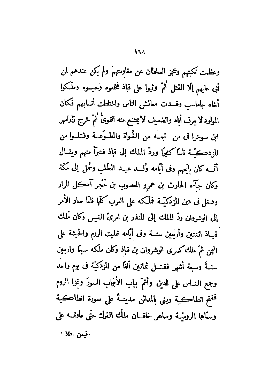 وعظمت نكبتهم وعجز السلطان عن مقاومتهم ولم يكن عندهم لمن أبى عليهم إلا القتل ثمّ وثبوا على قباذ فخلعوه وحبسوه وملّكوا أخاه جاماسب وفسدت معايش الناس واختلطت أنسابهم فكان المولود لا يعرف أباه والضعيف لا يمتنع منه القوي ثم خرج ز [ر] مهر ابن سوخرا في من [1] تبعه من الغواة والمطوّعة وقتلوا من المزدكيّة ناسا كثيرا ورد الملك إلى قباذ فتبرأ منهم ويقال أنه كان بايعهم وفي أيامه ولد عبد المطلب وحمل إلى مكة وكان جاءه الحارث بن عمرو المعصوب بن حجر آكل المرار ودخل في دين المزدكية فملكه على العرب كلها فلما صار الأمر إلى انوشروان رد الملك إلى المنذر بن امرئ القيس وكان ملك قباذ اثنتين وأربعين سنة وفي أيامه غلبت الروم والحبشة على اليمن ثم ملك كسرى انوشروان بن قباذ وكان ملكه سبعا وأربعين سنة وسبعة أشهر فقتل ثمانين ألفا من المزدكية في يوم واحد وجمع الناس على الدين وأتم بباب الأبواب السور وغزا الروم ففتح إنطاكية وبنى بالمدائن مدينة على صورة إنطاكية وسماها الرومية وصاهر خاقان ملك الترك حتّى عاونه على
