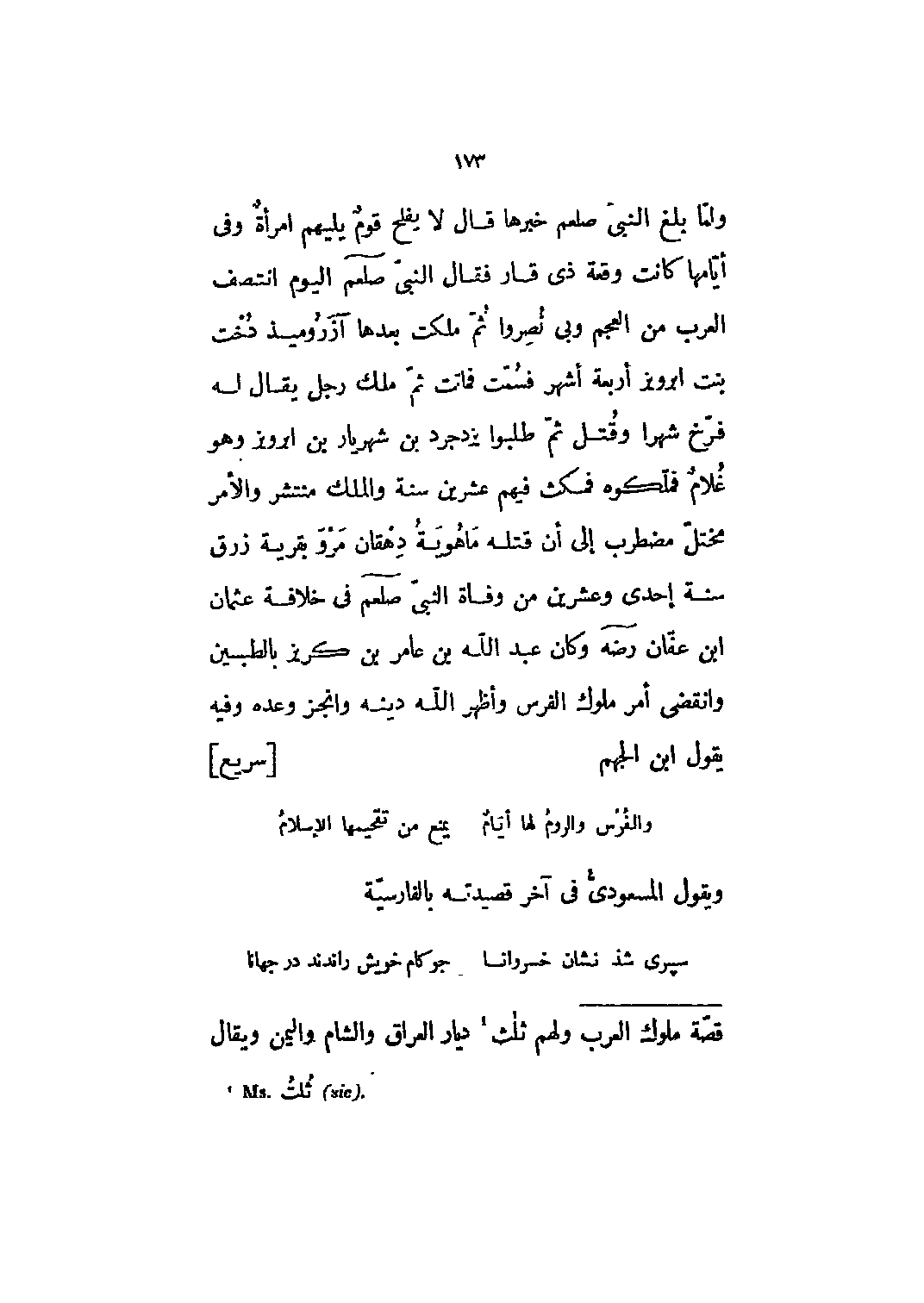 ولمّا بلغ النبيّ صلى الله عليه وسلم خبرها قال لا يفلح قوم يليهم امرأة وفي أيامها كانت وقعة ذي قار فقال النبيّ صلى الله عليه وسلم اليوم انتصف العرب من العجم وبي نصروا ثم ملكت بعدها آزروميذ دخت بنت ابرويز أربعة أشهر فسمت فماتت ثم ملك رجل يقال له فرخ شهرا وقتل ثم طلبوا يزدجرد بن شهريار بن ابرويز وهو غلام فملكوه فمكث فيهم عشرين سنة والملك منتشر والأمر مختل مضطرب إلى أن قتله ماهوية دهقان مرو بقرية زرق سنة إحدى وعشرين من وفاة النبي صلى الله عليه وسلم في خلافة عثمان ابن عفّان رضي الله عنه وكان عبد الله بن عامر بن كريز بالطبسين وانقضى أمر ملوك الفرس وأظهر الله دينه وانجز وعده وفيه يقول ابن الجهم [سريع]