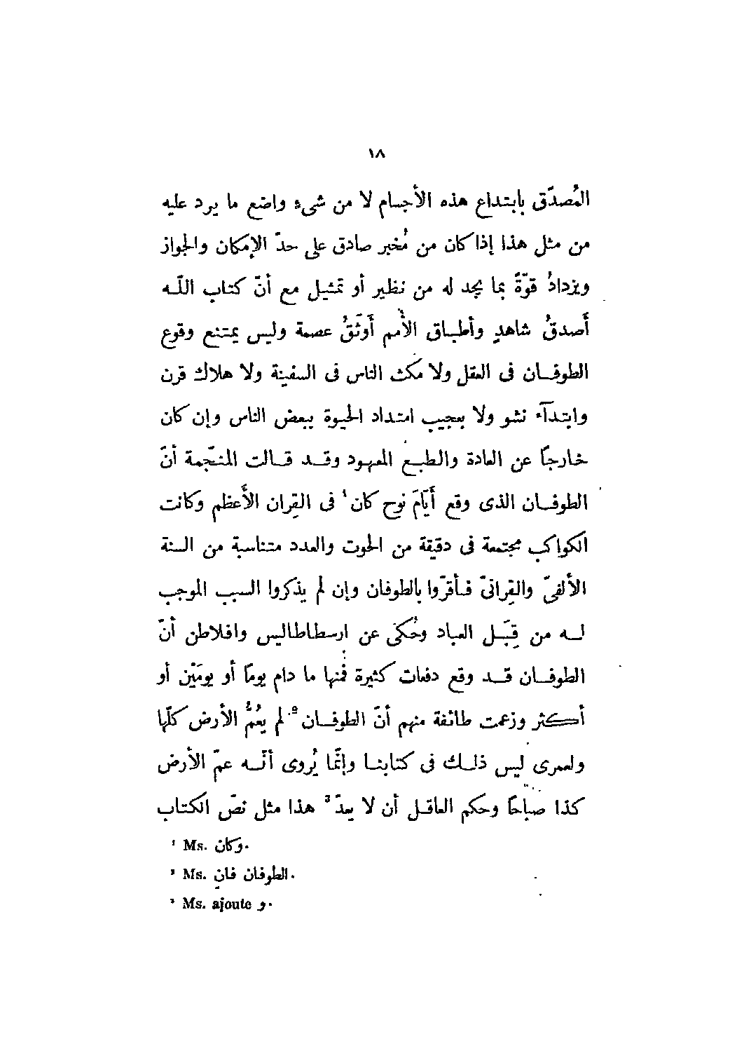 المصدق بابتداع هذه الأجسام لا من شيء واضع ما يرد عليه من مثل هذا إذا كان من مخبر صادق على حد الإمكان والجواز ويزداد قوة بما يجد له من نظير أو تمثيل مع أن كتاب الله أصدق شاهد وأطباق الأمم أوثق عصمة وليس ممتنع وقوع الطوفان في العقل ولا مكث الناس في السفينة ولا هلاك قرن وابتداء نشو ولا بعجيب امتداد الحياة ببعض الناس وإن كان خارجا عن العادة والطبع المعهود وقد قالت المنجمة أن الطوفان الذي وقع أيام نوح كان [1] في القران الأعظم وكانت الكواكب مجتمعة في دقيقة من الحوت والعدد متناسبة من السنة الألفي والقراني فأقروا بالطوفان وإن لم يذكروا السبب الموجب له من قبل العباد وحكي عن ارسطاطاليس وافلاطن أن الطوفان قد وقع دفعات كثيرة فمنها ما دام يوما أو يومين أو أكثر وزعمت طائفة منهم أن الطوفان [2] لم يعمّ الأرض كلّها ولعمري ليس ذلك في كتابنا وإنما يروى أنه عم الأرض كذا صباحا وحكم العاقل أن لا يعد [3] هذا مثل نصّ الكتاب