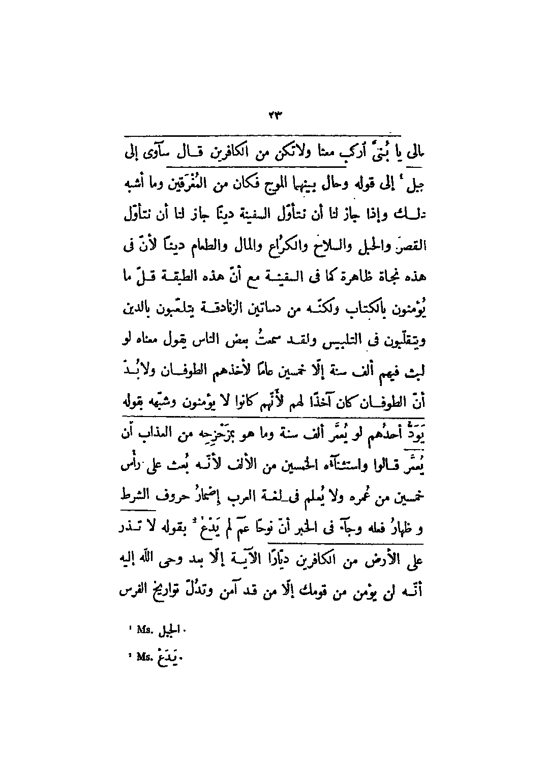 تعالى يا بُنَيَّ ارْكَبْ مَعَنا وَلا تَكُنْ مَعَ الْكافِرِينَ قال سَآوِي إِلى جَبَلٍ [1] 11: 42- 43 إلى قوله وَحالَ بَيْنَهُمَا الْمَوْجُ فَكانَ من الْمُغْرَقِينَ 11: 43 وما أشبه ذلك وإذا جاز لنا أن نتأول السفينة دينا جاز لنا أن نتأول القصر والحبل والسلاح والكراع والمال والطعام دينا لأن في هذه نجاة ظاهرة كما في السفينة مع أن هذه الطبقة قل ما يؤمنون بالكتاب ولكنه من دساتين الزنادقة يتلعبون بالدين ويتقلبون في التلبيس ولقد سمعت بعض الناس يقول معناه لو لبث فيهم ألف سنة إلّا خمسين عاما لأخذهم الطوفان ولا بدّ أن الطوفان كان آخذا لهم لأنهم كانوا لا يؤمنون وشبهه بقوله يَوَدُّ أَحَدُهُمْ لَوْ يُعَمَّرُ أَلْفَ سَنَةٍ وَما هُوَ بِمُزَحْزِحِهِ من الْعَذابِ أَنْ يُعَمَّرَ 2: 96 قالوا واستثناءه الخمسين من الألف لأنه بعث على رأس خمسين من عمره ولا يعلم في لغة العرب إضمار حروف الشرط وإظهار فعله وجاء في الخبر أن نوحا عم لم يدع [2] بقوله لا تَذَرْ عَلَى الْأَرْضِ من الْكافِرِينَ دَيَّاراً 71: 26 الآية إلا بعد وحي الله إليه أنه لن يؤمن من قومك إلا من قد آمن وتدلّ تواريخ الفرس