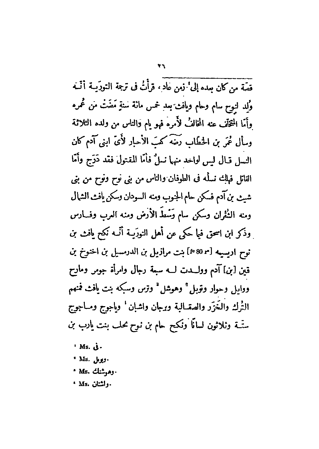 قرأت في ترجمة التوراة أنّه ولد لنوح سام وحام ويافث بعد خمس مائة سنة مضت من عمره وأما المتخلف عنه المخالف لأمره فهو يام والناس من ولده الثلاثة وسأل عمر بن الخطّاب رضي الله عنه كعب الأحبار لأي ابنى آدم كان النسل قال ليس لواحد منهما نسل فأما المقتول فقد درج وأما القاتل فهلك نسله في الطوفان والناس من بني نوح ونوح من بني شيث بن آدم فسكن حام الجنوب ومنه السودان وسكن يافث الشمال ومنه الشقران وسكن سام وسط الأرض ومنه العرب وفارس وذكر ابن إسحاق فيما حكى عن أهل التوراة أنه نكح يافث بن نوح اريسيمه [80] بنت مرازيل بن الدرمسيل بن أخنوخ بن قين [بن] آدم وولدت له سبعة رجال وامرأة جومر ومارح ووائل وحوار وتوبل [2] وهوشل [3] وترس وسبكه بنت يافث فمنهم الترك والخزر والصقالبة وبرجان واشبان [4] وياجوج وماجوج ستة وثلاثون لسانا ونكح حام بن نوح حل بنت يارب بن