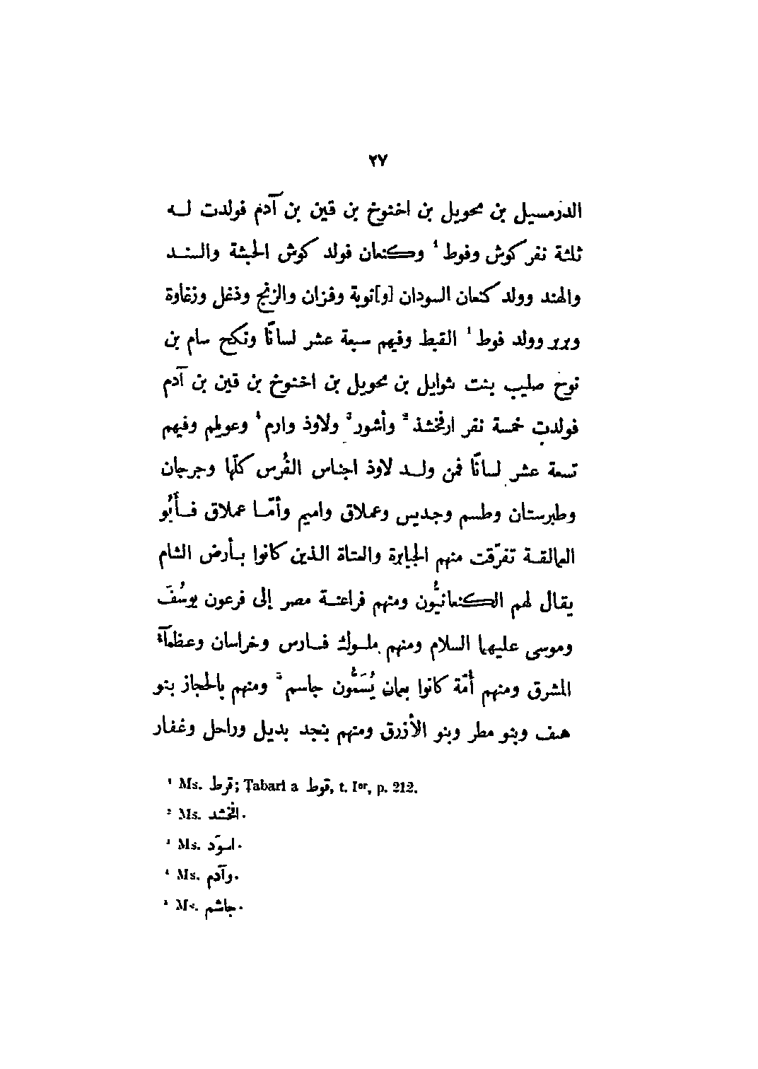 الدرمسيل بن محويل بن أخنوخ بن قين بن آدم فولدت له ثلاثة نفر كوش وفوط [1] وكنعان فولد كوش الحبشة والسند والهند وولد كنعان السودان [و] نوبة وفزان والزنج وزغل وزغاوة وبربر وولد فوط [1] القبط وفيهم سبعة عشر لسانا ونكح سام بن نوح صليب بنت ثوايل بن محويل بن أخنوخ بن قين بن آدم فولدت خمسة نفر ارفخشذ [2] وأشور [3] ولاوذ وارم [4] وعويلم وفيهم تسعة عشر لسانا فمن ولد لاوذ اجناس الفرس كلها وجرجان وطبرستان وطسم وجديس وعملاق وأميم وأما عملاق فأبو العمالقة تفرقت منهم الجبابرة والعتاة الذين كانوا بأرض الشام يقال لهم الكنعانيون ومنهم فراعنة مصر إلى فرعون يوسف وموسى عليهما السلام ومنهم ملوك فارس وخراسان وعظماء المشرق ومنهم أمة كانوا بعمان يسمون جاسم [5] ومنهم بالحجاز بنو هف وبنو مطر وبنو الأزرق ومنهم بنجد بديل وراحل وغفار