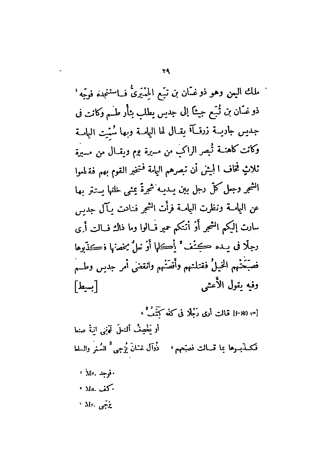 ملك اليمن وهو ذو غسان بن تبع الحميري فاستنجده فوجه [1] ذو غسان بن تبع جيشا إلى جديس يطلب بثأر طسم وكانت في جديس جارية زرقاء يقال لها اليمامة وبها سميت اليمامة وكانت كاهنة تبصر الراكب من مسيرة يوم ويقال من مسيرة ثلاث فخاف الجيش أن تبصرهم اليمامة فتخبر القوم بهم فقطعوا الشجر وجعل كل رجل بين يديه شجرة يمشي خلفها يستتر بها عن اليمامة ونظرت اليمامة فرأت الشجر فنادت يا آل جديس سارت إليكم الشجر أو أتتكم حمير قالوا وما ذاك قالت أرى رجلا في يده كتف [2] يأكلها أو نعل يخصفها فكذبوها فصبحتهم الخيل فقتلتهم وأقصتهم وانقضى أمر جديس وطسم وفيه يقول الأعشى [بسيط]