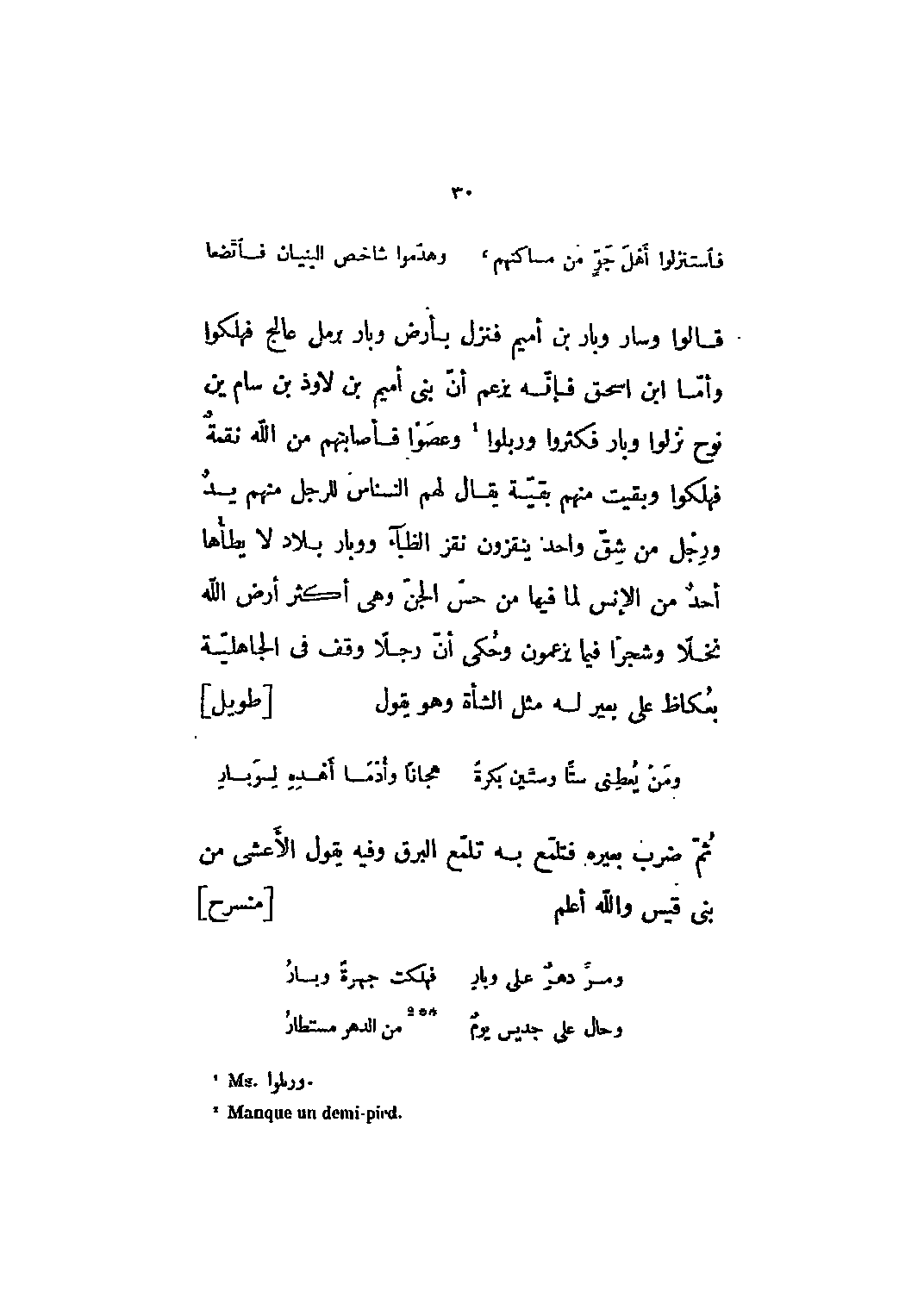 قالوا وسار وبار بن أميم فنزل بأرض وبار برمل عالج فهلكوا وأما ابن إسحاق فإنه يزعم أن بني أميم بن لاوذ بن سام بن نوح نزلوا وبار فكثروا وربلوا [1] وعصوا فأصابتهم من الله نقمة فهلكوا وبقيت منهم بقية يقال لهم النسناس للرجل منهم يد ورجل من شق واحد ينقزون نقز الظباء ووبار بلاد لا يطأها أحد من الإنس لما فيها من حسّ الجن وهي أكثر أرض الله نخلا وشجرا فيما يزعمون وحكي أن رجلا وقف في الجاهلية بعكاظ على بعير له مثل الشاة وهو يقول [طويل]