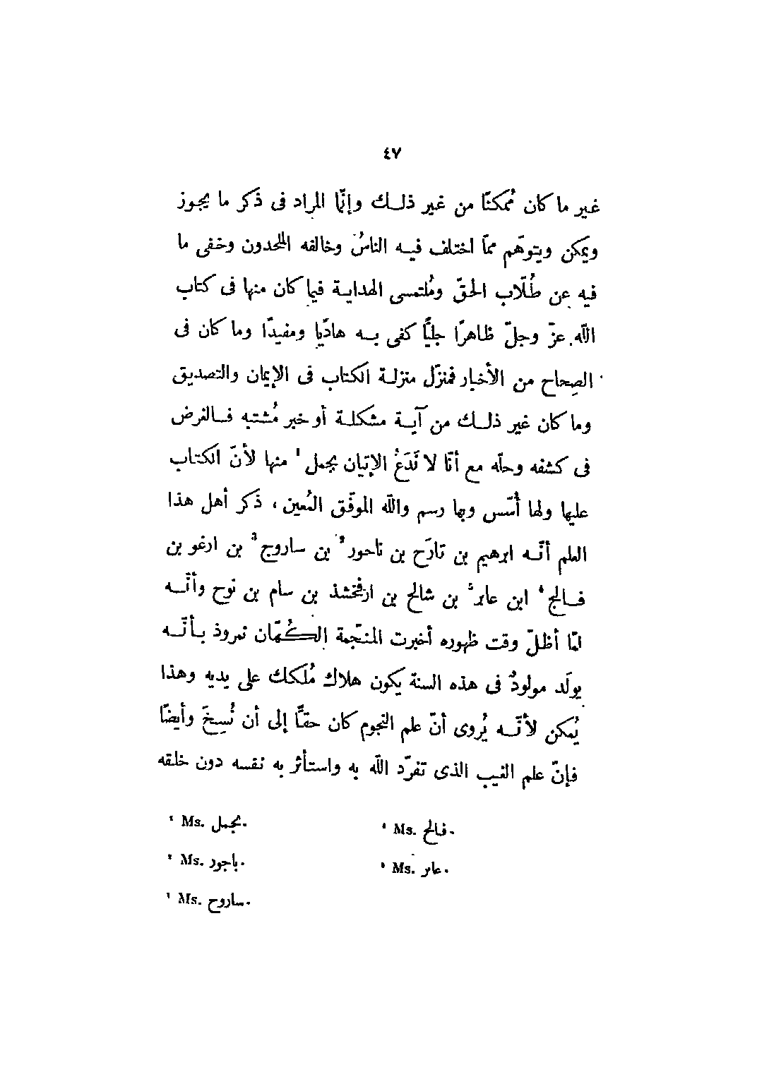غير ما كان ممكنا من غير ذلك وإنما المراد في ذكر ما يجوز ويمكن ويتوهم مما اختلف فيه الناس وخالفه الملحدون وخفى ما فيه عن طلاب الحق وملتمسي الهداية فيما كان منها في كتاب الله عزّ وجلّ ظاهرا جليّا كفى به هاديا ومفيدا وما كان في الصحاح من الأخبار فمنزل منزلة الكتاب في الإيمان والتصديق وما كان غير ذلك من آية مشكلة أو خبر مشتبه فالغرض في كشفه وحله مع أنا لا ندع الإتيان بجمل [1] منها لأن الكتاب عليها ولها أسس وبها رسم والله الموفق المعين، ذكر أهل هذا العلم أنه ابراهيم بن تارح بن ناحور [2] بن ساروج [3] بن ارغو بن فالج [4] ابن عابر [5] بن شالح بن ارفخشذ بن سام بن نوح وأنه لما أظل وقت ظهوره أخبرت المنجمة الكهان نمروذ بأنه يولد مولود في هذه السنة يكون هلاك ملكك على يديه وهذا يمكن لأنه يروى أن علم النجوم كان حقا إلى أن نسخ وأيضاً فإن علم الغيب الذي تفرد الله به واستأثر به نفسه دون خلقه