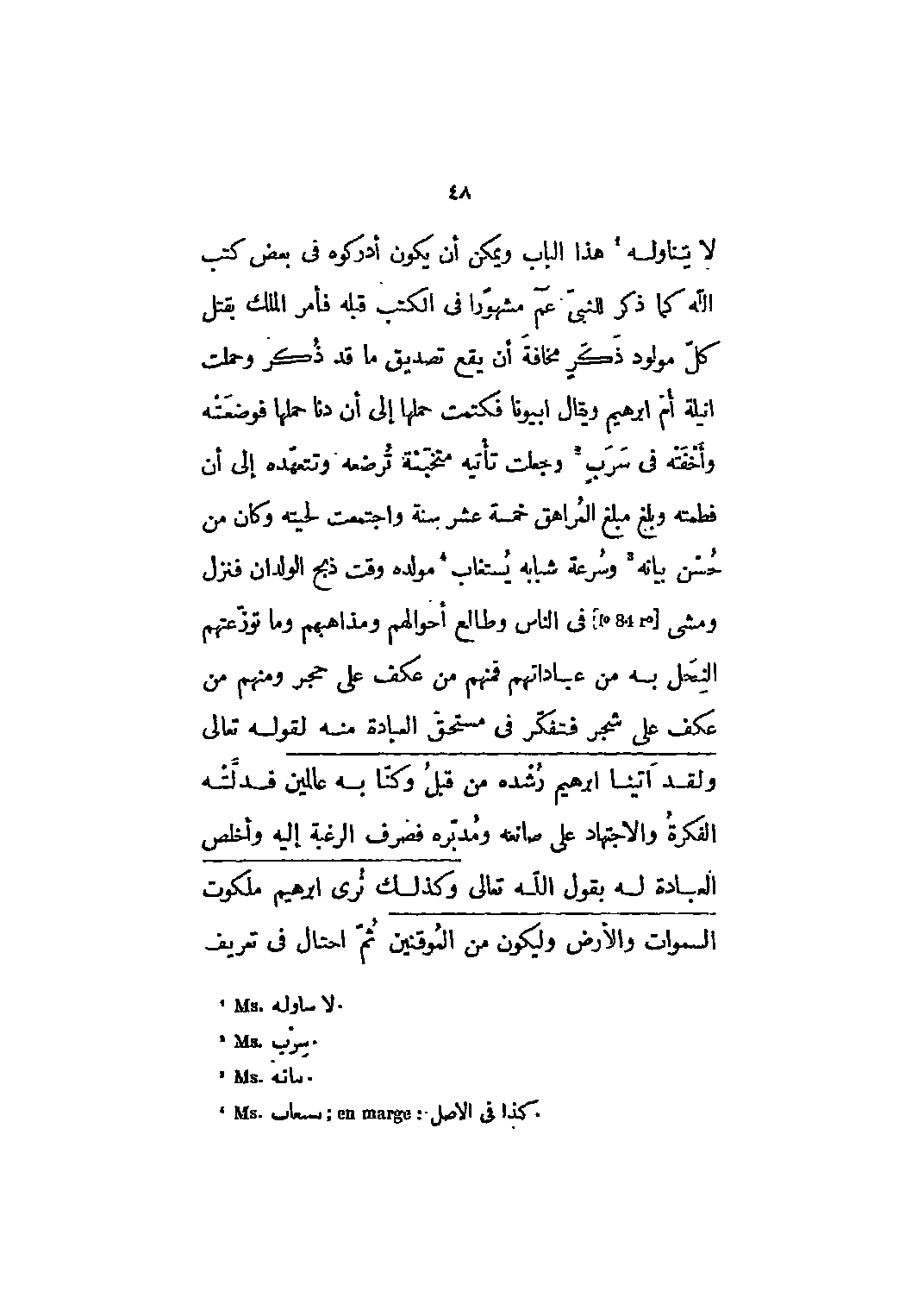 لا يتناوله [1] هذا الباب ويمكن أن يكون أدركوه في بعض كتب الله كما ذكر للنبي عم مشهوراً في الكتب قبله فأمر الملك بقتل كل مولود ذكر مخافة أن يقع تصديق ما قد ذكر وحملت أنيلة أم ابراهيم ويقال أبيونا فكتمت حملها إلى أن دنا حملها فوضعته وأخفته في سرب [2] وجعلت تأتيه متخبئة ترضعه وتتعهده إلى أن فطمته وبلغ مبلغ المراهق خمسة عشر سنة واجتمعت لحيته وكان من حسن بيانه [3] وسرعة شبابه يستغاب [4] مولده وقت ذبح الولدان فنزل ومشى [84] في الناس وطالع أحوالهم ومذاهبهم وما توزعتهم النحل به من عباداتهم فمنهم من عكف على حجر ومنهم من عكف على شجر فتفكر في مستحق العبادة منه لقوله تعالى وَلَقَدْ آتَيْنا إِبْراهِيمَ رُشْدَهُ من قَبْلُ وَكُنَّا به عالِمِينَ 21: 51 فدلته الفكرة والاجتهاد على صانعه ومدبره فصرف الرغبة إليه وأخلص العبادة له بقول الله تعالى وَكَذلِكَ نُرِي إِبْراهِيمَ مَلَكُوتَ السَّماواتِ وَالْأَرْضِ وَلِيَكُونَ من الْمُوقِنِينَ 6: 75 ثم احتال في تعريف
