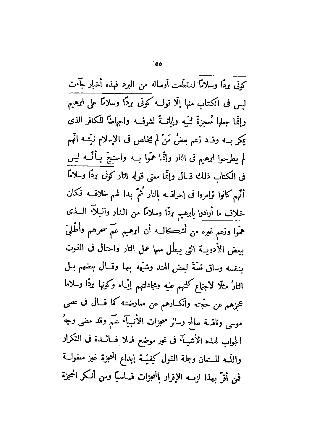 كُونِي بَرْداً وَسَلاماً 21: 69 لتقطعت أوصاله من البرد فهذه أخبار جاءت ليس في الكتاب منها إلا قوله كُونِي بَرْداً وَسَلاماً عَلى إِبْراهِيمَ 21: 69 وإنما جعلها معجزة لنبيه وإبانة لشرفه وإجهاضاً للكافر الذي يمكر به وقد زعم بعض من لم يخلص في الإسلام نيته أنهم لم يطرحوا إبراهيم في النار وإنما هموا به واحتج بأنه ليس في الكتاب ذلك قال وإنّما معنى قوله للنار كُونِي بَرْداً وَسَلاماً 21: 69 أنهم كانوا توامروا في إحراقه بالنار ثم بدا لهم خلافه فكان خلاف ما أرادوا بإبراهيم بردا وسلاما من النار والبلاء الّذي همّوا وزعم غيره من أشكاله أن إبراهيم عم سحرهم وأطلي ببعض الأدوية التي يبطل معها عمل النار واحتال في الفوت بنفسه وساق قصة لبعض الهند وشبهه بها وقال بعضهم بل النار مثلا لاجتماع كلمتهم عليه ومجادلتهم إياه وكونها بردا وسلاما عجزهم عن حجته وانكسارهم عن معارضته كما قال في عصى موسى وناقة صالح وسائر معجزات الأنبياء عم وقد مضى وجه الجواب لهذه الأشياء في غير موضع فلا فائدة في التكرار والله المستعان وجملة القول كيفية إبداع المعجزة غير معقولة فمن أقرّ بهذا لزمه الإقرار بالمعجزات قاسيا ومن أنكر المعجزة