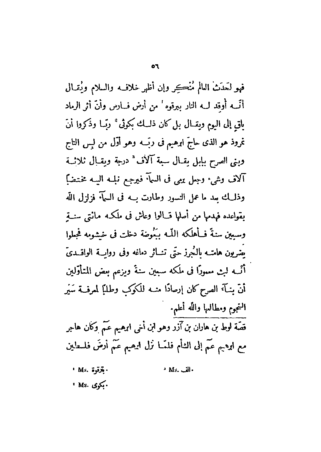 فهو لحدث العالم منكر وأن أظهر خلافه والسلام ويقال أنه أوقد له النار ببرقوة [1] من أرض فارس وأن أثر الرماد باق إلى اليوم ويقال بل كان ذلك بكوثى [2] ربا وذكروا أن نمروذ هو الذي حاج إبراهيم في ربه وهو أول من لبس التاج وبنى الصرح ببابل يقال سبعة آلاف [3] درجة ويقال ثلاثة آلاف وشيء وجعل يرمي في السماء فيرجع نبله إليه مختضبا وذلك بعد ما عمل النسور وطارت به في السماء فزلزل الله بقواعده فهدمها من أصلها قالوا وعاش في ملكة مائتي سنة وسبعين سنة فأهلكه الله ببعوضة دخلت في خيشومه فجعلوا يضربون هامته بالجرز حتى تناثر دماغه وفي رواية الواقدي أنه لبث معمورا في ملكه سبعين سنة ويزعم بعض المتأولين أن بناء الصرح كان إرصادا منه للكوكب وطلبا لمعرفة سير النجوم ومطالعها والله أعلم.