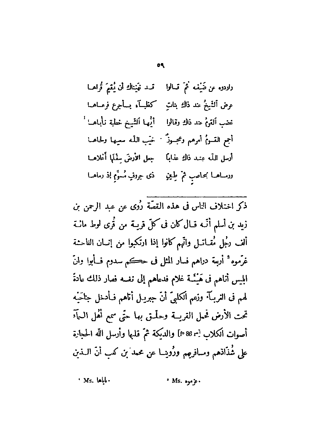 روى عن عبد الرحمن بن زيد بن أسلم أنه قال كان في كل قرية من قرى لوط مائة ألف رجل مقاتل وأنهم كانوا إذا ارتكبوا من إنسان الفاحشة غرموه [2] أربعة دراهم فسار المثل في حكم سدوم فأبوا وانّ ابليس أتاهم في هيئة غلام فدعاهم إلى نفسه فصار ذلك عادة لهم في الغرباء وزعم الكلبي أن جبريل أتاهم فأدخل جناحيه تحت الأرض فحمل القرية وحلق بها حتى سمع أهل السماء أصوات الكلاب [86] والديكة ثم قلبها وأرسل الله الحجارة على شذاذهم ومسافريهم وروينا عن محمد بن كعب أن الذين