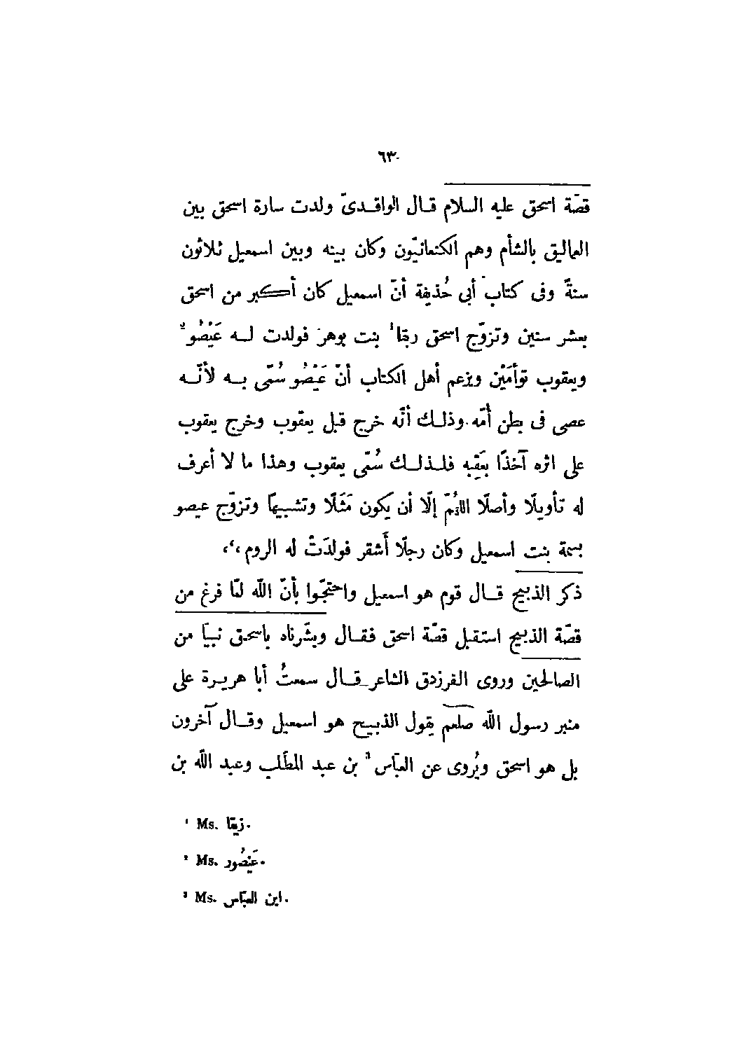 قال الواقديّ ولدت سارة إسحاق بين العماليق بالشآم وهم الكنعانيون وكان بينه وبين إسماعيل ثلاثون سنة وفي كتاب أبي حذيفة أن إسماعيل كان أكبر من إسحاق بعشر سنين وتزوّج إسحاق ربقا [1] بنت بوهر فولدت له عيصو [2] ويعقوب توأمين ويزعم أهل الكتاب أن عيصو سمي به لأنه عصى في بطن أمه وذلك أنه خرج قبل يعقوب وخرج يعقوب على إثره آخذا بعقبه فلذلك سمي يعقوب وهذا ما لا أعرف له تأويلا وأصلا اللَّهمّ إلا أن يكون مثلا وتشبيها وتزوج عيصو بسمة بنت إسماعيل وكان رجلا أشقر فولدت له الروم،،،
