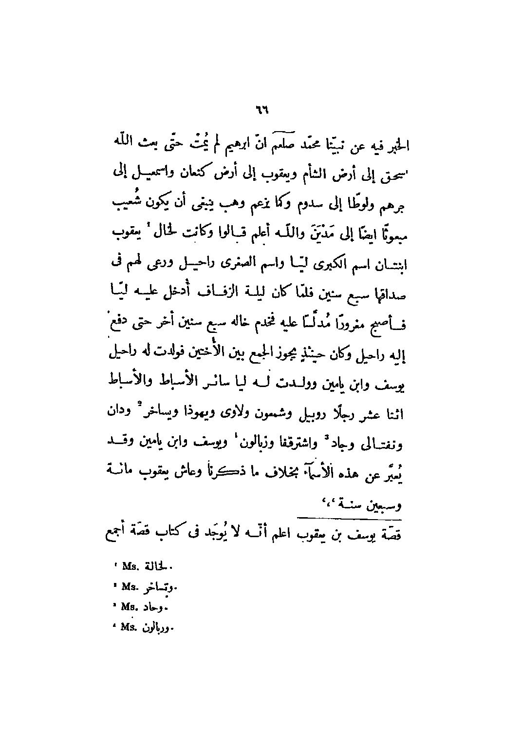 الخبر فيه عن نبيّنا محمّد صلى الله عليه وسلم أن إبراهيم لم يمت حتى بعث الله إسحاق إلى أرض الشام ويعقوب إلى أرض كنعان وإسماعيل إلى جرهم ولوطا إلى سدوم وكما يزعم وهب ينبغي أن يكون شعيب مبعوثا أيضا إلى مدين والله أعلم قالوا وكانت لخال [1] يعقوب ابنتان اسم الكبرى ليا واسم الصغرى راحيل ورعى لهم في صداقها سبع سنين فلمّا كان ليلة الزفاف أدخل عليه ليا فأصبح مغروراً مدلسا عليه فخدم خاله سبع سنين أخر حتى دفع إليه راحيل وكان حينئذ يجوز الجمع بين الأختين فولدت له راحيل يوسف وابن يامين وولدت له ليا سائر الأسباط والأسباط اثنا عشر رجلا روبيل وشمعون ولاوى ويهوذا ويساخر [2] ودان ونفتالي وجاد [3] واشترقفا وزبالون [4] ويوسف وابن يامين وقد يعبر عن هذه الأسماء بخلاف ما ذكرنا وعاش يعقوب مائة وسبعين سنة،،،