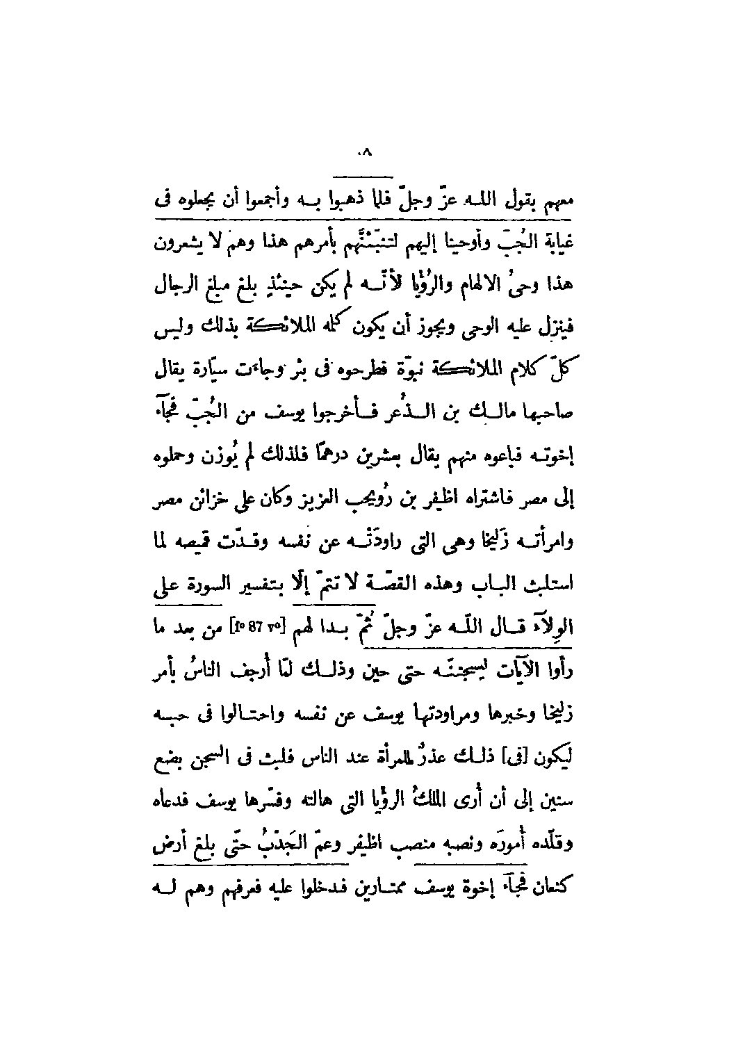 معهم بقول الله عز وجل فَلَمَّا ذَهَبُوا به وَأَجْمَعُوا أَنْ يَجْعَلُوهُ في غَيابَتِ الْجُبِّ وَأَوْحَيْنا إِلَيْهِ لَتُنَبِّئَنَّهُمْ بِأَمْرِهِمْ هذا وَهُمْ لا يَشْعُرُونَ 12: 15 هذا وحي الإلهام والرؤيا لأنه لم يكن حينئذ بلغ مبلغ الرجال فينزل عليه الوحي ويجوز أن يكون كلمه الملائكة بذلك وليس كل كلام الملائكة نبوة فطرحوه في بئر وجاءت سيّارة يقال صاحبها مالك بن الذعر فأخرجوا يوسف من الجب فجاء اخوته فباعوه منهم يقال بعشرين درهما فلذلك لم يوزن وحملوه إلى مصر فاشتراه اظيفر بن رويحب العزيز وكان على خزائن مصر وامرأته زليخا وهي التي راودته عن نفسه وقدت قميصه لما استلبث الباب وهذه القصة لا تتم إلا بتفسير السورة على الولاء قال الله عز وجل ثُمَّ بَدا لَهُمْ [87] من بَعْدِ ما رَأَوُا الْآياتِ لَيَسْجُنُنَّهُ حَتَّى حِينٍ 12: 35 وذلك لما أرجف الناس بأمر زليخا وخبرها ومراودتها يوسف عن نفسه واحتالوا في حبسه ليكون [في] ذلك عذر للمرأة عند الناس فلبث في السجن بضع سنين إلى أن أرى الملك الرؤيا التي هالته وفسرها يوسف فدعاه وقلده أموره ونصبه منصب اظيفر وعم الجدب حتّى بلغ أرض كنعان ف جاءَ إِخْوَةُ يُوسُفَ 12: 58 ممتارين فَدَخَلُوا عَلَيْهِ فَعَرَفَهُمْ وَهُمْ لَهُ