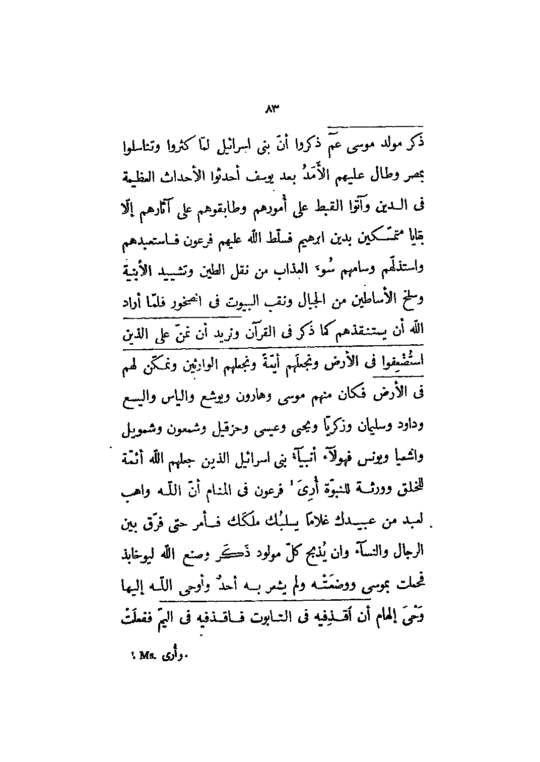 ذكروا أن بني اسرائيل لما كثروا وتناسلوا بمصر وطال عليهم الأمد بعد يوسف أحدثوا الأحداث العظيمة في الدين وآتوا القبط على أمورهم وطابقوهم على آثارهم إلا بقايا متمسكين بدين إبراهيم فسلط الله عليهم فرعون فاستعبدهم واستذلهم وسامهم سوء العذاب من نقل الطين وتشييد الأبنية وسلخ الأساطين من الجبال ونقب البيوت في الصخور فلما أراد الله أن يستنقذهم كما ذكر في القرآن وَنُرِيدُ أَنْ نَمُنَّ عَلَى الَّذِينَ اسْتُضْعِفُوا في الْأَرْضِ وَنَجْعَلَهُمْ أَئِمَّةً وَنَجْعَلَهُمُ الْوارِثِينَ وَنُمَكِّنَ لَهُمْ في الْأَرْضِ 28: 5- 6 فكان منهم موسى وهارون ويوشع والياس واليسع وداود وسليمان وزكريا ويحيى وعيسى وحزقيل وشمعون وشمويل واشعيا ويونس فهولاء أنبياء بني اسرائيل الذين جعلهم الله أئمة للخلق وورثة للنبوة أري [1] فرعون في المنام أن الله واهب لعبد من عبيدك غلاما يسلبك ملكك فأمر حتى فرق بين الرجال والنساء وأن يذبح كل مولود ذكر وصنع الله ليوخابذ فحملت بموسى ووضعته ولم يشعر به أحد وأوحى الله إليها وحي إلهام أَنِ اقْذِفِيهِ في التَّابُوتِ فَاقْذِفِيهِ في الْيَمِّ 20: 39 ففعلت