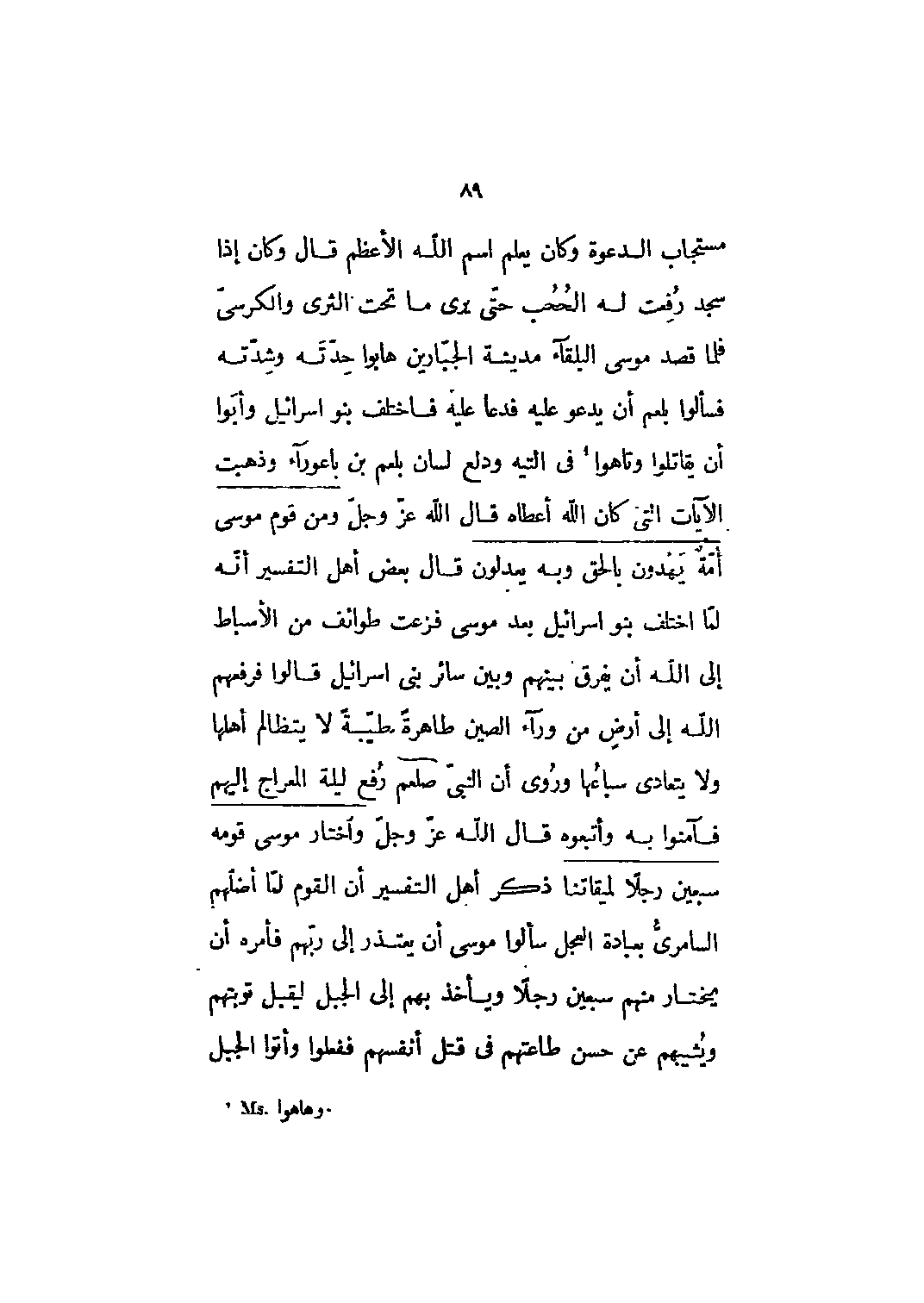 مستجاب الدعوة وكان يعلم اسم الله الأعظم قال وكان إذا سجد رفعت له الحجب حتّى يرى ما تحت الثرى والكرسي فلما قصد موسى البلقاء مدينة الجبارين هابوا حدته وشدته فسألوا بلعم أن يدعو عليه فدعا عليه فاختلف بنو إسرائيل وأبوا أن يقاتلوا وتاهوا [1] في التيه ودلع لسان بلعم بن باعوراء وذهبت الآيات التي كان الله أعطاه قال الله عز وجل وَمن قَوْمِ مُوسى أُمَّةٌ يَهْدُونَ بِالْحَقِّ وَبه يَعْدِلُونَ 7: 159 قال بعض أهل التفسير أنه لما اختلف بنو إسرائيل بعد موسى فزعت طوائف من الأسباط إلى الله أن يفرق بينهم وبين سائر بني إسرائيل قالوا فرفعهم الله إلى أرض من وراء الصين طاهرة طيبة لا يتظالم أهلها ولا يتعادى سباعها وروى أن النبي صلى الله عليه وسلم رفع ليلة المعراج إليهم فآمنوا به واتبعوه قال الله عز وجل وَاخْتارَ مُوسى قَوْمَهُ سَبْعِينَ رَجُلًا لِمِيقاتِنا 7: 155 ذكر أهل التفسير أن القوم لما أضلهم السامري بعبادة العجل سألوا موسى أن يعتذر إلى ربهم فأمره أن يختار منهم سبعين رجلا ويأخذ بهم إلى الجبل ليقبل توبتهم ويثيبهم عن حسن طاعتهم في قتل أنفسهم ففعلوا وأتوا الجبل