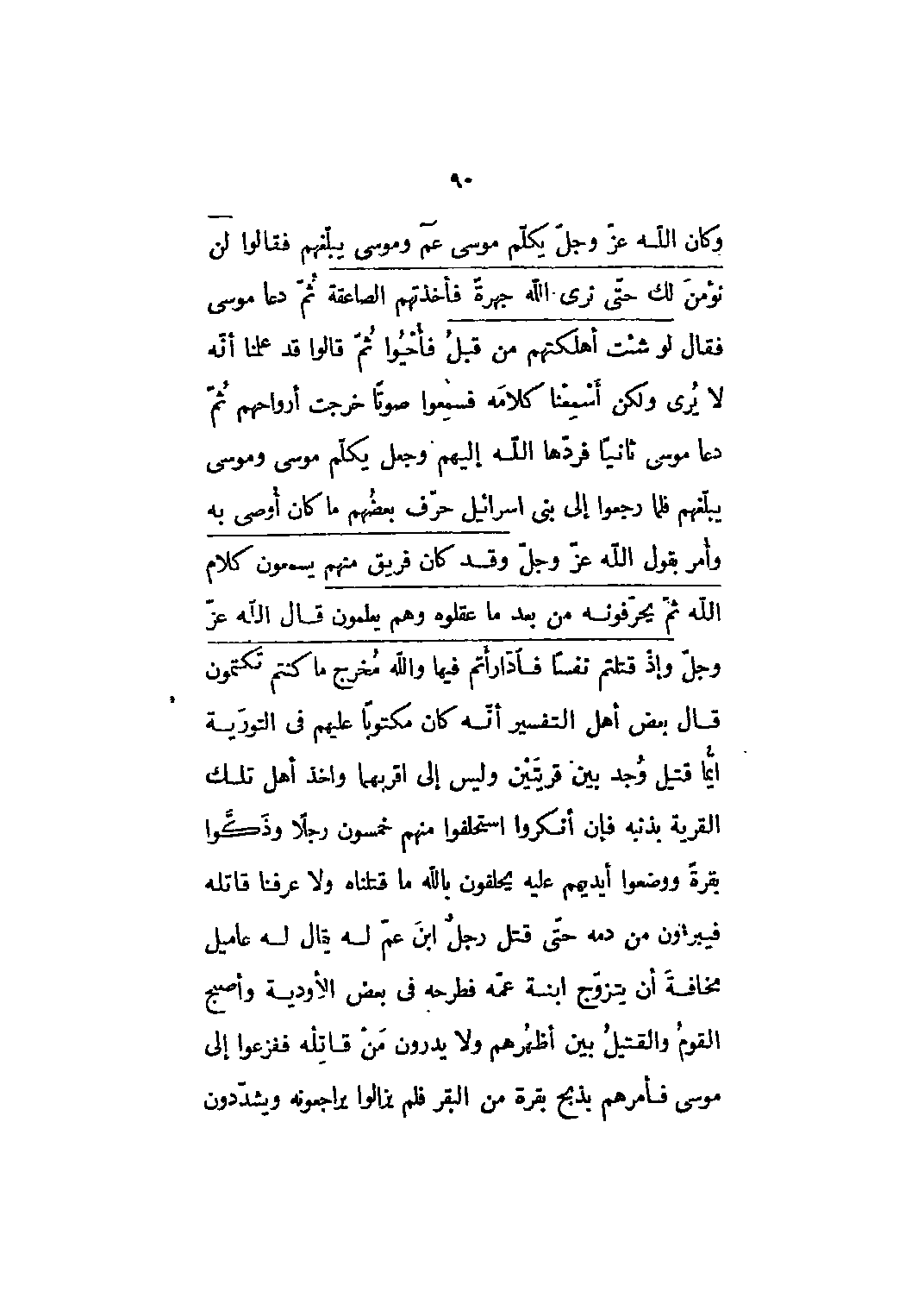 وكان الله عز وجل يكلم موسى عم وموسى يبلغهم فقالوا لَنْ نُؤْمِنَ لَكَ حَتَّى نَرَى الله جَهْرَةً 2: 55 ... فَأَخَذَتْهُمُ الصَّاعِقَةُ 4: 153 ثم دعا موسى فقال لَوْ شِئْتَ أَهْلَكْتَهُمْ من قَبْلُ 7: 155 فأحيوا ثم قالوا قد علمنا أنه لا يرى ولكن أسمعنا كلامه فسمعوا صوتا خرجت أرواحهم ثم دعا موسى ثانيا فردها الله إليهم وجعل يكلم موسى وموسى يبلغهم فلما رجعوا إلى بني إسرائيل حرف بعضهم ما كان أوصى به وأمر بقول الله عز وجل وَقَدْ كانَ فَرِيقٌ مِنْهُمْ يَسْمَعُونَ كَلامَ الله ثُمَّ يُحَرِّفُونَهُ من بَعْدِ ما عَقَلُوهُ وَهُمْ يَعْلَمُونَ 2: 75 قال الله عز وجل وَإِذْ قَتَلْتُمْ نَفْساً فَادَّارَأْتُمْ فِيها وَالله مُخْرِجٌ ما كُنْتُمْ تَكْتُمُونَ 2: 72 قال بعض أهل التفسير أنه كان مكتوبا عليهم في التورية ايما قتيل وجد بين قريتين وليس إلى أقربهما واخذ أهل تلك القرية بذنبه فإن أنكروا استحلفوا منهم خمسون رجلا وذكوا بقرة ووضعوا أيديهم عليه يحلفون باللَّه ما قتلناه ولا عرفنا قاتله فيبرءون من دمه حتى قتل رجل ابن عم له يقال له عاميل مخافة أن يتزوج ابنة عمه فطرحه في بعض الأودية وأصبح القوم والقتيل بين أظهرهم ولا يدرون من قاتله ففزعوا إلى موسى فأمرهم بذبح بقرة من البقر فلم يزالوا يراجعونه ويشددون