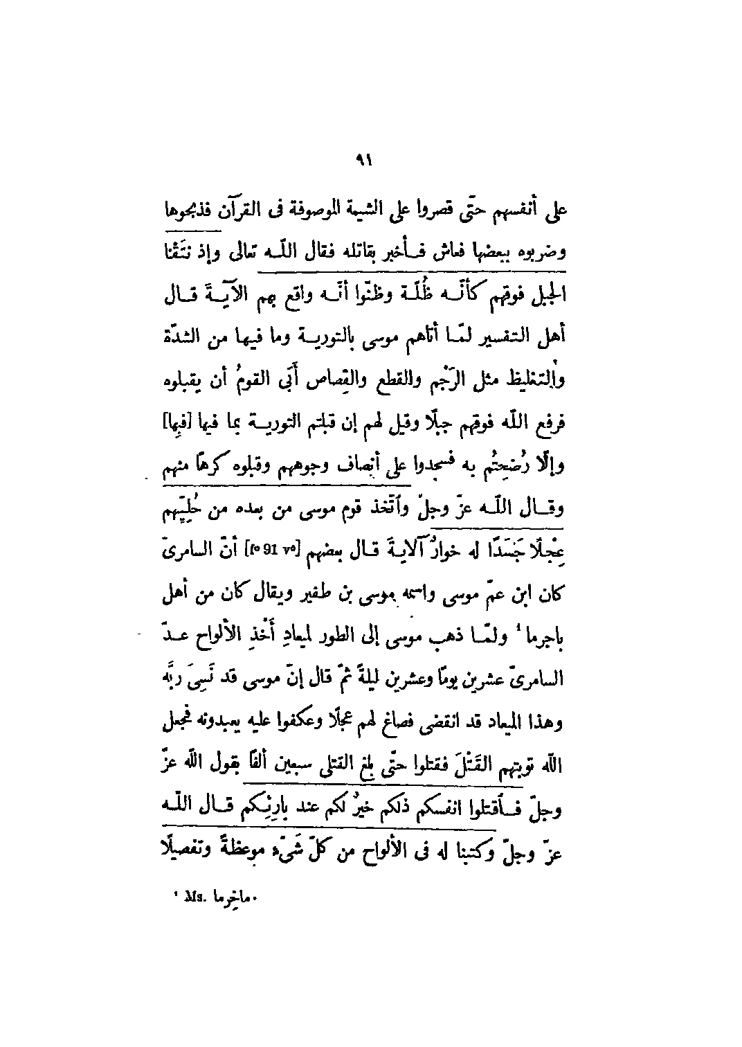 على أنفسهم حتى قصروا على الشيمة الموصوفة في القرآن فذبحوها وضربوه ببعضها فعاش فأخبر بقاتله فقال الله تعالى وإِذْ نَتَقْنَا الْجَبَلَ فَوْقَهُمْ كَأَنَّهُ ظُلَّةٌ وَظَنُّوا أَنَّهُ واقِعٌ بِهِمْ 7: 171 الآية قال أهل التفسير لما أتاهم موسى بالتوراة وما فيها من الشدة والتغليظ مثل الرجم والقطع والقصاص أبى القوم أن يقبلوه فرفع الله فوقهم جبلا وقيل لهم إن قبلتم التوراة بما فيها [فبها] وإلا رضحتم به فسجدوا على أنصاف وجوههم وقبلوه كرها منهم وقال الله عز وجل وَاتَّخَذَ قَوْمُ مُوسى من بَعْدِهِ من حُلِيِّهِمْ عِجْلًا جَسَداً لَهُ خُوارٌ 7: 148 الآية قال بعضهم [91] أن السامري كان ابن عم موسى واسمه موسى بن طفير ويقال كان من أهل باجرما [1] ولما ذهب موسى إلى الطور لميعاد أخذ الألواح عد السامري عشرين يوما وعشرين ليلة ثم قال إن موسى قد نسى ربه وهذا الميعاد قد انقضى فصاغ لهم عجلا وعكفوا عليه يعبدونه فجعل الله توبتهم القتل فقتلوا حتى بلغ القتلى سبعين ألفا بقول الله عز وجل فَاقْتُلُوا أَنْفُسَكُمْ ذلِكُمْ خَيْرٌ لَكُمْ عِنْدَ بارِئِكُمْ 2: 54 قال الله عز وجل وَكَتَبْنا لَهُ في الْأَلْواحِ من كُلِّ شَيْءٍ مَوْعِظَةً وَتَفْصِيلًا لِكُلِّ شَيْءٍ 7: 145