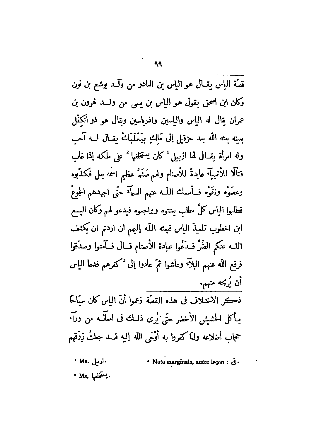يقال هو الياس بن العادر من ولد يوشع بن نون وكان ابن إسحاق بقول هو الياس بن يسى من ولد هارون بن عمران يقال له الياس والياسين واذرياسين ويقال هو ذو الكفل بعينه بعثه الله بعد حزقيل إلى ملك ببعلبك يقال له آحب وله امرأة يقال لها ازبيل [1] كان يستخلفها [2] على ملكه إذا غاب قتالا للأنبياء عابدة للأصنام ولهم صنم عظيم اسمه بعل فكذبوه وعصوه ونفوه فأمسك الله عنهم السماء حتى أجهدهم الجوع فطلبوا الياس كل مطلب يعنتوه ويراجعوه فيدعو لهم وكان اليسع ابن أخطوب تلميذ الياس فبعثه الله إليهم ان أردتم أن يكشف الله عنكم الضر فدعوا عبادة الأصنام قال فآمنوا وصدقوا فرفع الله عنهم البلاء وعاشوا ثم عادوا إلى [3] كفرهم فدعا الياس أن يريحه منهم.