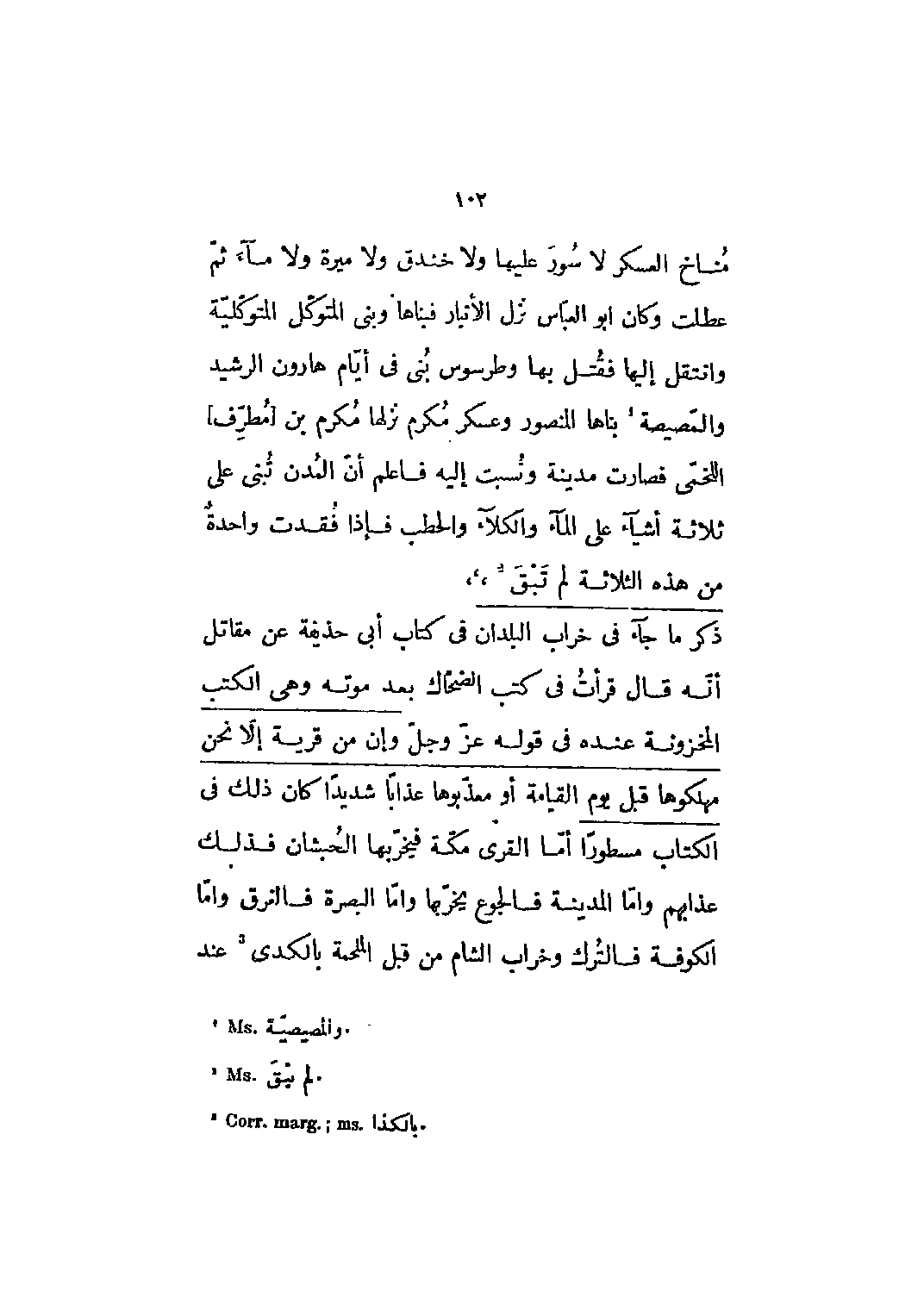 مناخ العسكر لا سور عليها ولا خندق ولا ميرة ولا ماء ثم عطلت وكان أبو العباس نزل الأنبار فبناها وبنى المتوكل المتوكلية وانتقل إليها فقتل بها وطرسوس بني في أيام هارون الرشيد والمصيصة [1] بناها المنصور وعسكر مكرم نزلها مكرم بن [مطرف] اللخمي فصارت مدينة ونسبت إليه فاعلم أن المدن تبنى على ثلاثة أشياء على الماء والكلاء والحطب فإذا فقدت واحدة من هذه الثلاثة لم تبق [2] ،،،