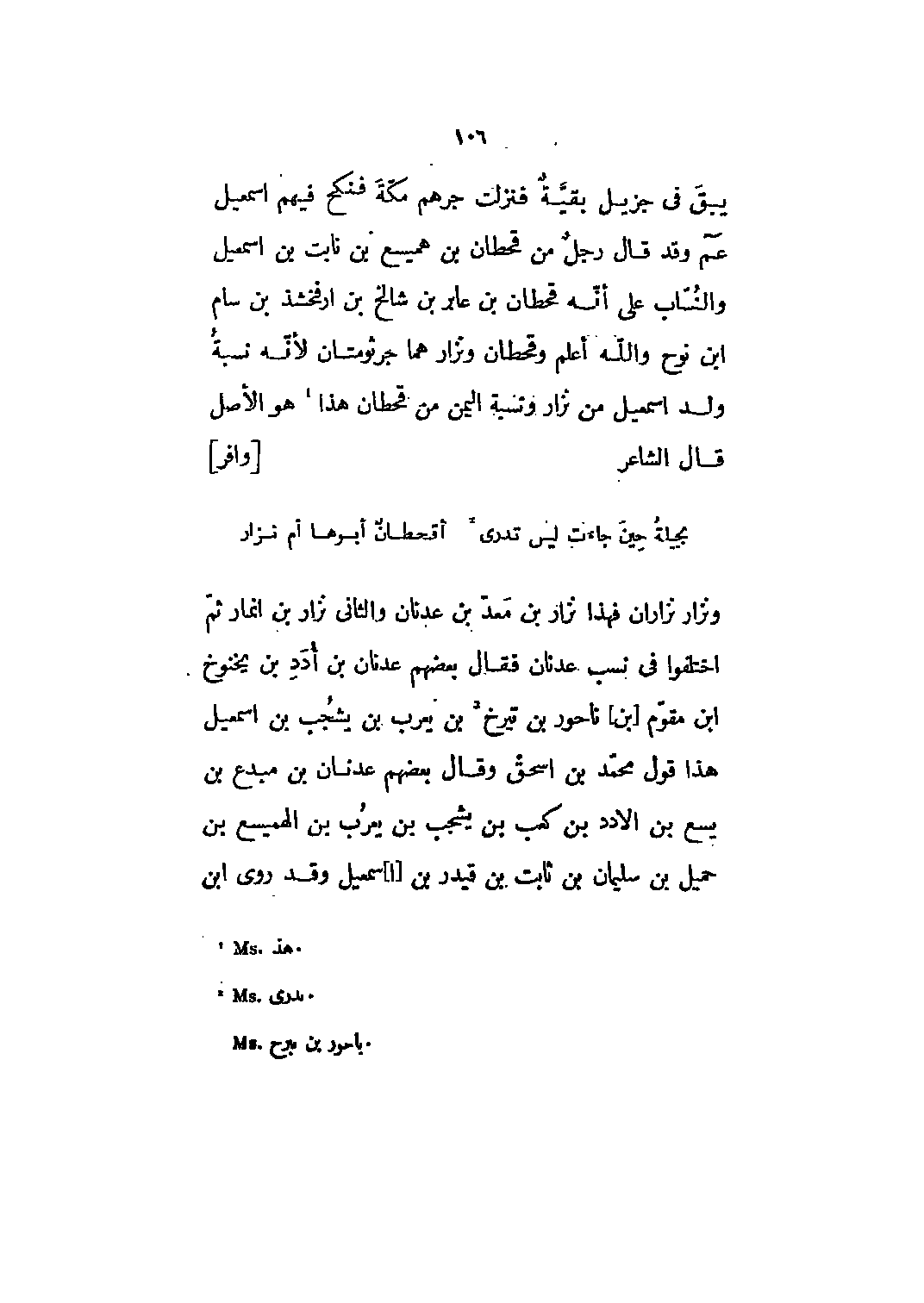 ونزار نزاران فهذا نزار بن معد بن عدنان والثاني نزار بن انمار ثم اختلفوا في نسب عدنان فقال بعضهم عدنان بن أدد بن يخنوخ ابن مقوم [بن] ناحور بن تيرخ [3] بن يعرب بن يشجب بن اسماعيل هذا قول محمد بن إسحاق وقال بعضهم عدنان بن مبدع بن يسع بن الأدد بن كعب بن يشجب بن يعرب بن الهميسع بن حميل بن سليمان بن ثابت بن قيدر بن [أ] إسماعيل وقد روى ابن