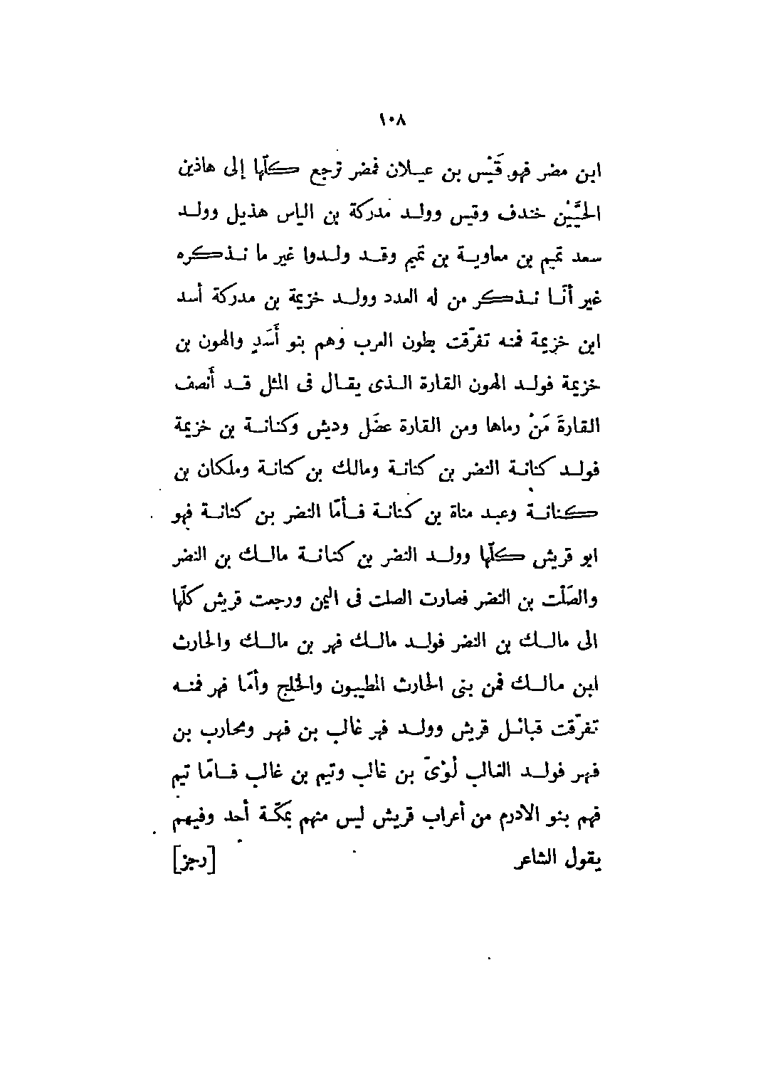 ابن مضر فهو قيس بن عيلان فمضر ترجع كلها إلى هذين الحيين خندف وقيس وولد مدركة بن الياس هذيل وولد سعد تميم بن معاوية بن تميم وقد ولدوا غير ما نذكره غير أنا نذكر من له العدد وولد خزيمة بن مدركة أسد ابن خزيمة فمنه تفرقت بطون العرب وهم بنو أسد والهون بن خزيمة فولد الهون القارة الذي يقال في المثل قد أنصف القارة من رماها ومن القارة عضل وديش وكنانة بن خزيمة فولد كنانة النضر بن كنانة ومالك بن كنانة وملكان بن كنانة وعبد مناة بن كنانة فأما النضر بن كنانة فهو أبو قريش كلها وولد النضر بن كنانة مالك بن النضر والصلت بن النضر فصارت الصلت في اليمن ورجعت قريش كلها الى مالك بن النضر فولد مالك فهو بن مالك والحارث ابن مالك فمن بني الحارث المطيبون والخلج وأما فهر فمنه تفرقت قبائل قريش وولد فهر غالب بن فهر ومحارب بن فهر فولد الغالب لؤيّ بن غالب وتيم بن غالب فامّا تيم فهم بنو الادرم من أعراب قريش ليس منهم بمكّة أحد وفيهم يقول الشاعر [رجز]