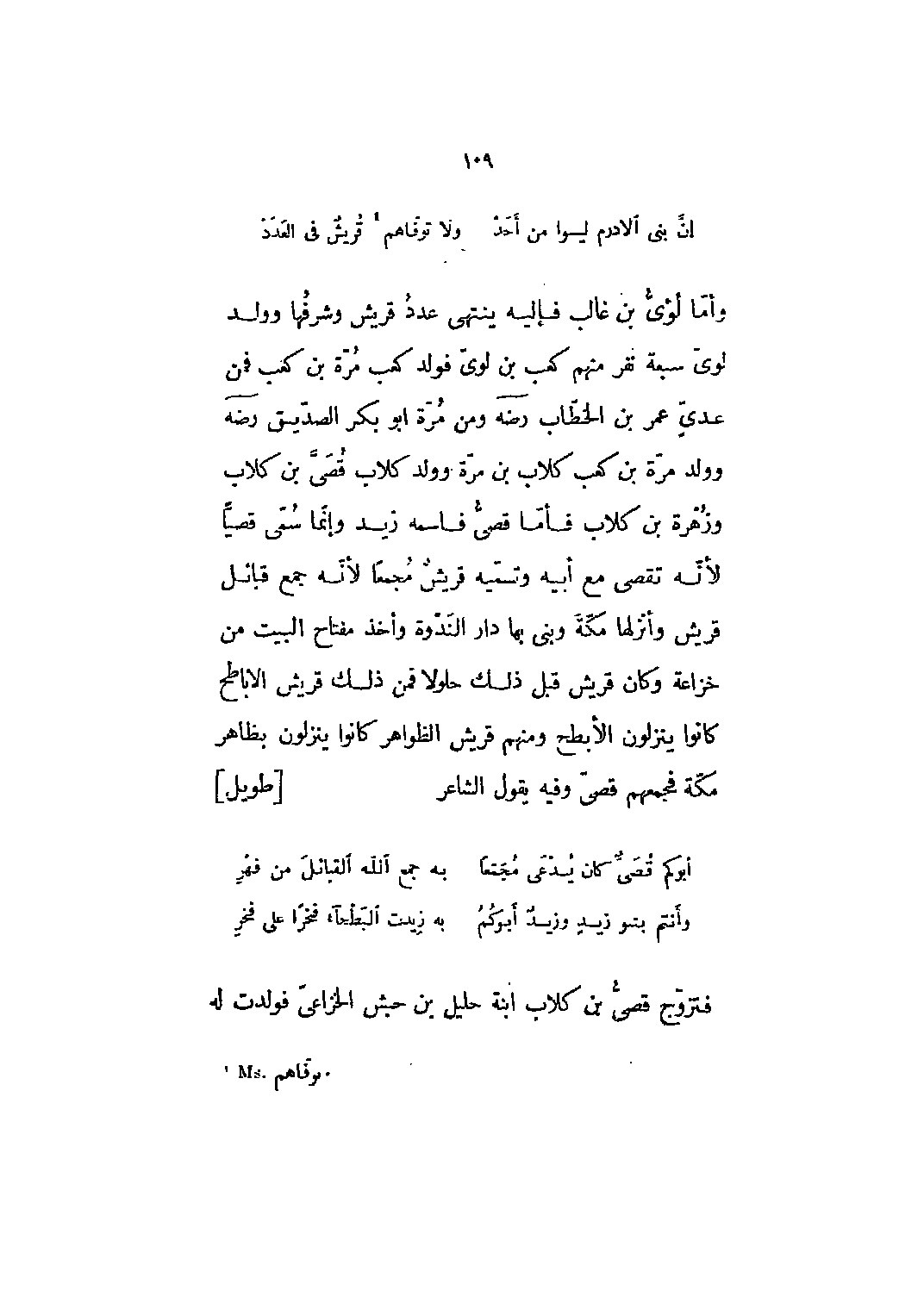 وأمّا لؤي بن غالب فإليه ينتهي عدد قريش وشرفها وولد لؤي سبعة نفر منهم كعب بن لؤي فولد كعب مرة بن كعب فمن عدي عمر بن الخطّاب رضي الله عنه ومن مرّة ابو بكر الصدّيق رضي الله عنه وولد مرة بن كعب كلاب بن مرة وولد كلاب قصي بن كلاب وزهرة بن كلاب فأما قصي فاسمه زيد وإنما سمي قصيّا لأنّه قصىّ مع أبيه وتسمية قريش مجمعا لأنه جمع قبائل قريش وأنزلها مكة وبنى بها دار الندوة وأخذ مفتاح البيت من خزاعة وكان قريش قبل ذلك حلولا فمن ذلك قريش الاباطح كانوا ينزلون الأبطح ومنهم قريش الظواهر كانوا ينزلون بظاهر مكة فجمعهم قصي وفيه يقول الشاعر [طويل]