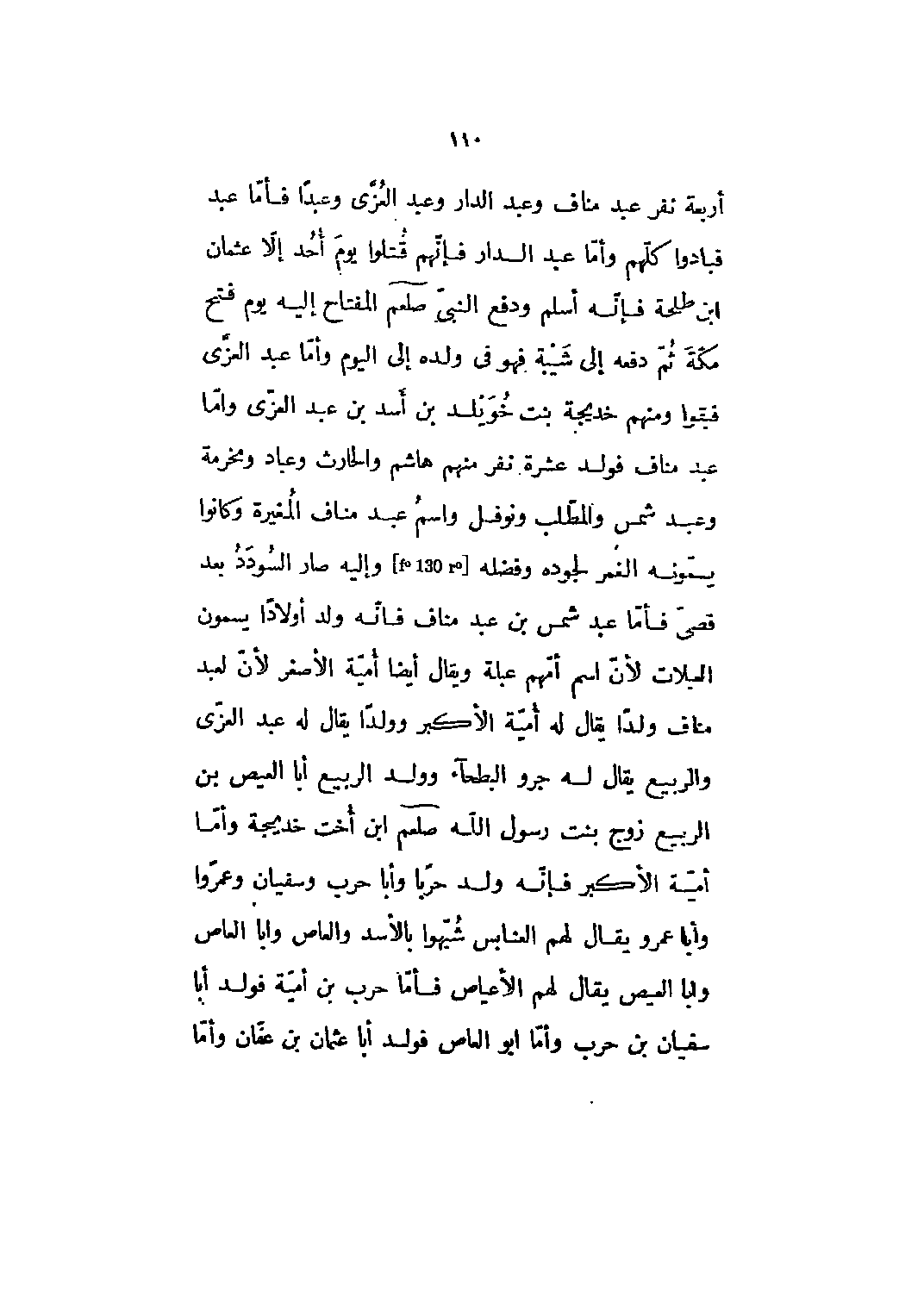 أربعة نفر عبد مناف وعبد الدار وعبد العزّى وعبدا فأمّا عبد فبادوا كلّهم وأما عبد الدار فإنهم قتلوا يوم أحد إلا عثمان ابن طلحة فإنّه أسلم ودفع النبيّ صلى الله عليه وسلم المفتاح إليه يوم فتح مكة ثم دفعه إلى شيبة فهو في ولده إلى اليوم وأما عبد العزي فبقوا ومنهم خديجة بنت خويلد بن أسد بن عبد العزي وأما عبد مناف فولد عشرة نفر منهم هاشم والحارث وعباد ومخرمة وعبد شمس والمطلب ونوفل واسم عبد مناف المغيرة وكانوا يسمونه الغمر لجوده وفضله [F 130 r] وإليه صار السؤدد بعد قصي فأما عبد شمس بن عبد مناف فانه ولد أولادا يسمون العبلات لأن اسم أمهم عبلة ويقال أيضا أمية الأصغر لأن لعبد مناف ولدا يقال له أمية الأكبر وولدا يقال له عبد العزي والربيع يقال له جرو البطحاء وولد الربيع أبا العيص بن الربيع زوج بنت رسول الله صلى الله عليه وسلم ابن أخت خديجة وأما أمية الأكبر فإنه ولد حربا وأبا حرب وسفيان وعمروا وأبا عمرو يقال لهم العنابس شبهوا بالأسد والعاص وابا العيص يقال لهم الأعياص فأما حرب بن أمية فولد أبا سفيان بن حرب وأما أبو العاص فولد أبا عثمان بن عفان وأما